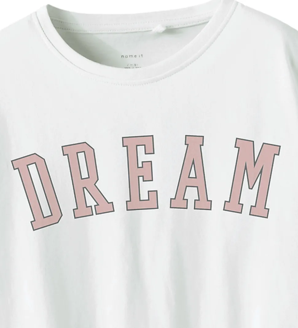 Fin Name It t-shirt i klassisk hvid med teksten “DREAM” i rosa, der giver et enkelt, men iøjnefaldende udtryk. Name It t-shirten har en rund halsudskæring med en diskret ribkant, hvilket giver et stilrent look.