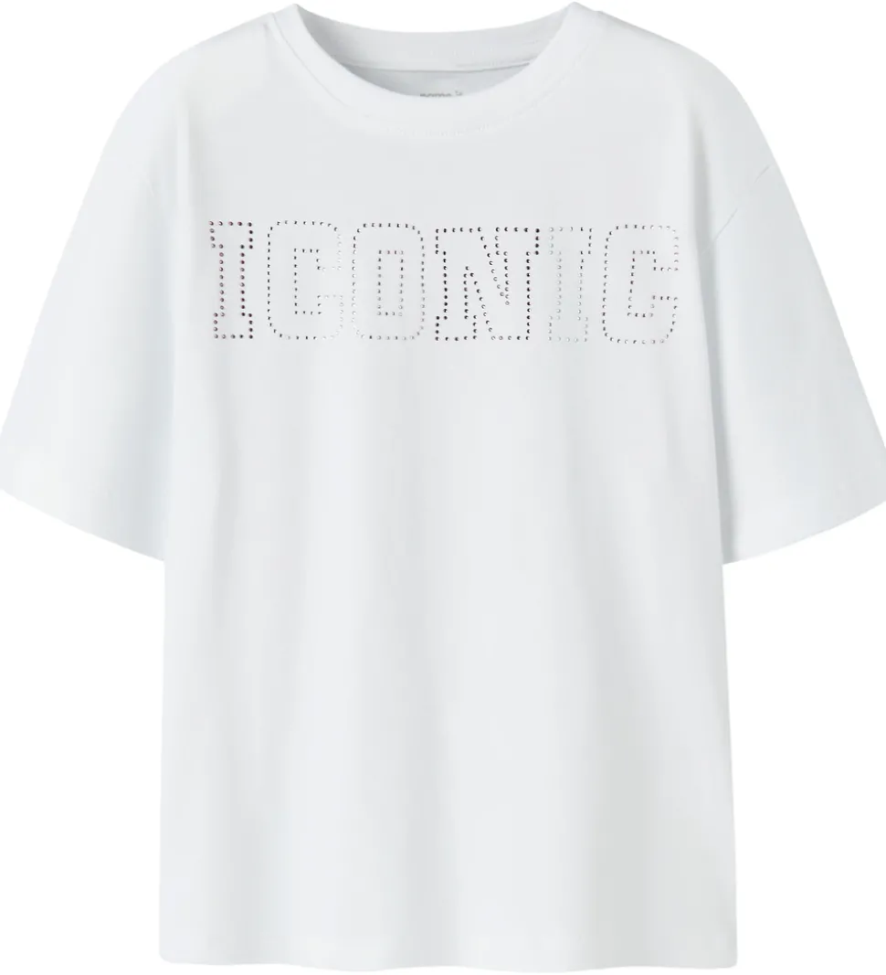Smart Name It t-shirt i hvid med små similisten på fronten i sølv, rosa og brun som former ordet “Studio”. Name It t-shirten har en rund halsudskæring med en smal ribkant og korte ærmer.
