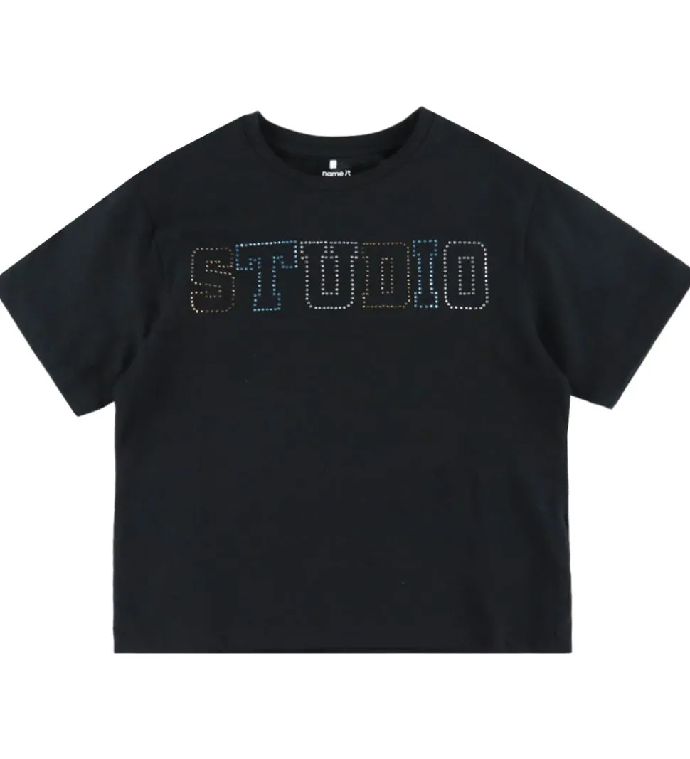 Flot Name It t-shirt i sort med små similisten på fronten i blå, hvid og brun som former ordet “Studio”. Name It t-shirten har en rund halsudskæring med en smal ribkant og lange ærmer.