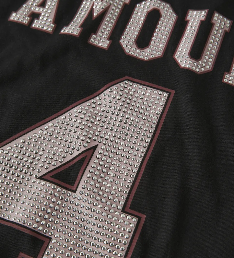 Smart Name It t-shirt i sort med teksten “Amour 4” i rosa med små similisten. Name It t-shirten har en klassisk rund halsudskæring og korte ærmer.