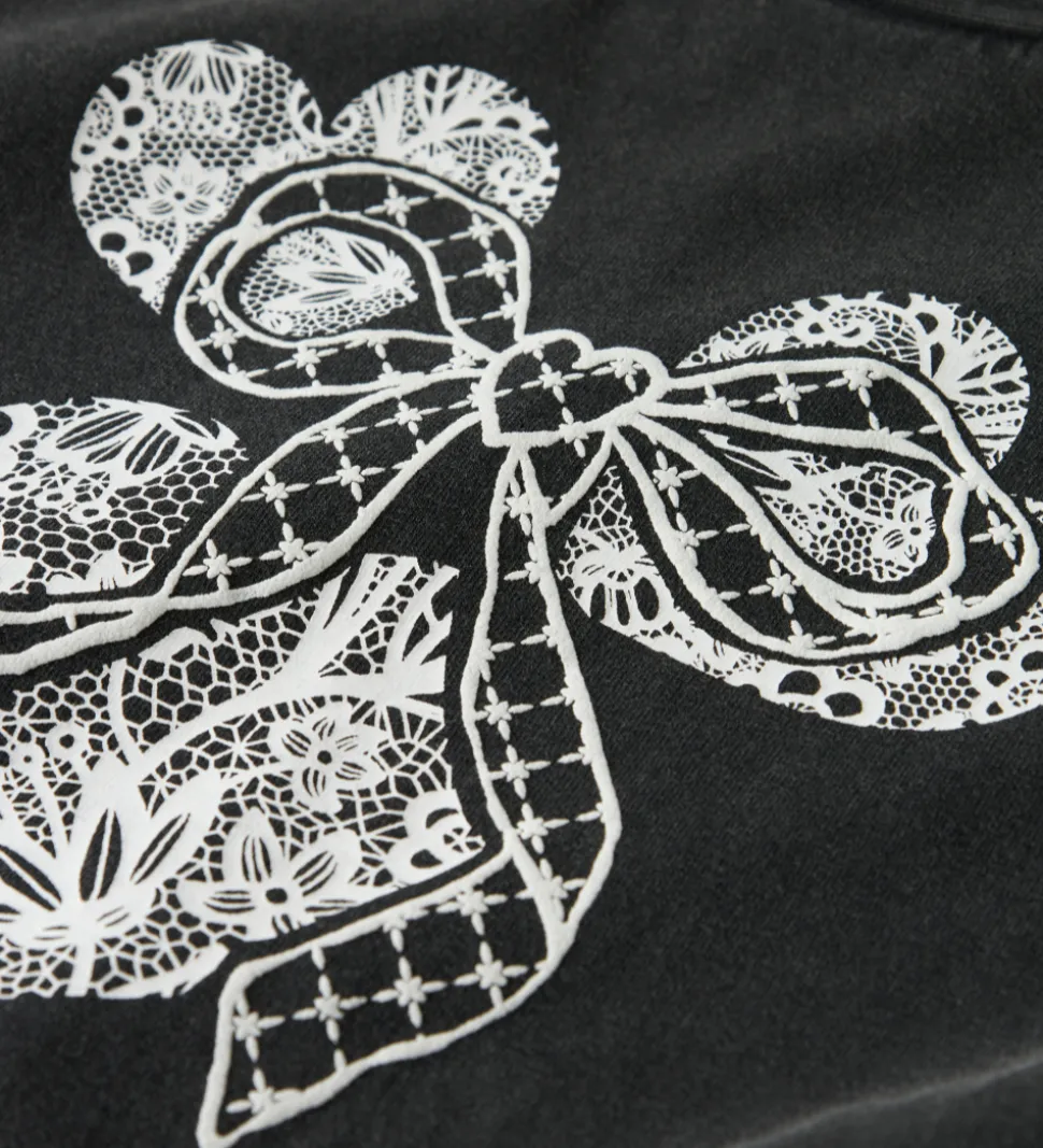 Elegant Name It t-shirt i en klassisk, sort farve. T-shirten prydes af et detaljeret, hvidt mønster med blonder, der forestiller en sløjfe og hjerter på forsiden. Denne Name It t-shirt har en rund halsudskæring og korte ærmer.
