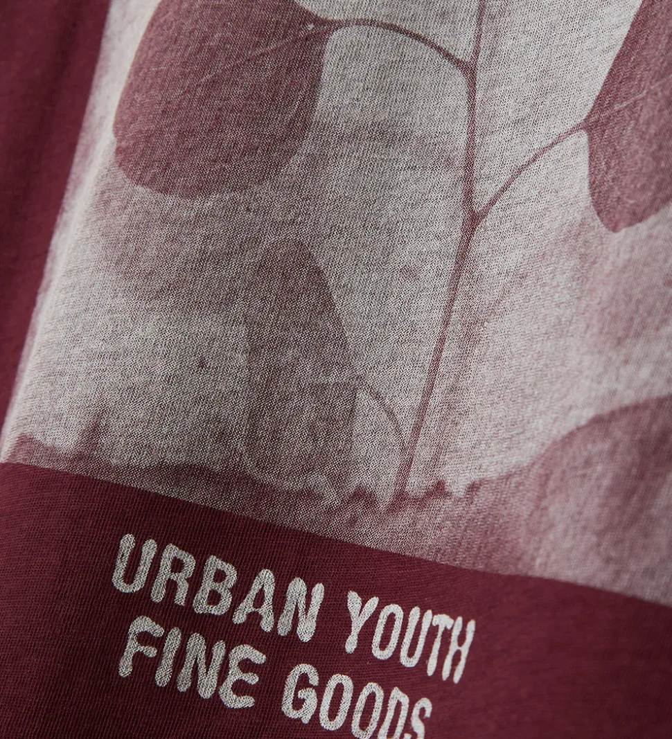 Moderne Name It t-shirt i en dyb bordeaux farve. T-shirten er designet med teksten “Eco Warrior Positive Influencer” i hvid på venstre bryst. På ryggen er der et stort print med tekst og blade i lyse nuancer. Name It t-shirten har en rund halsudskæring med en smal ribkant og korte ærmer.