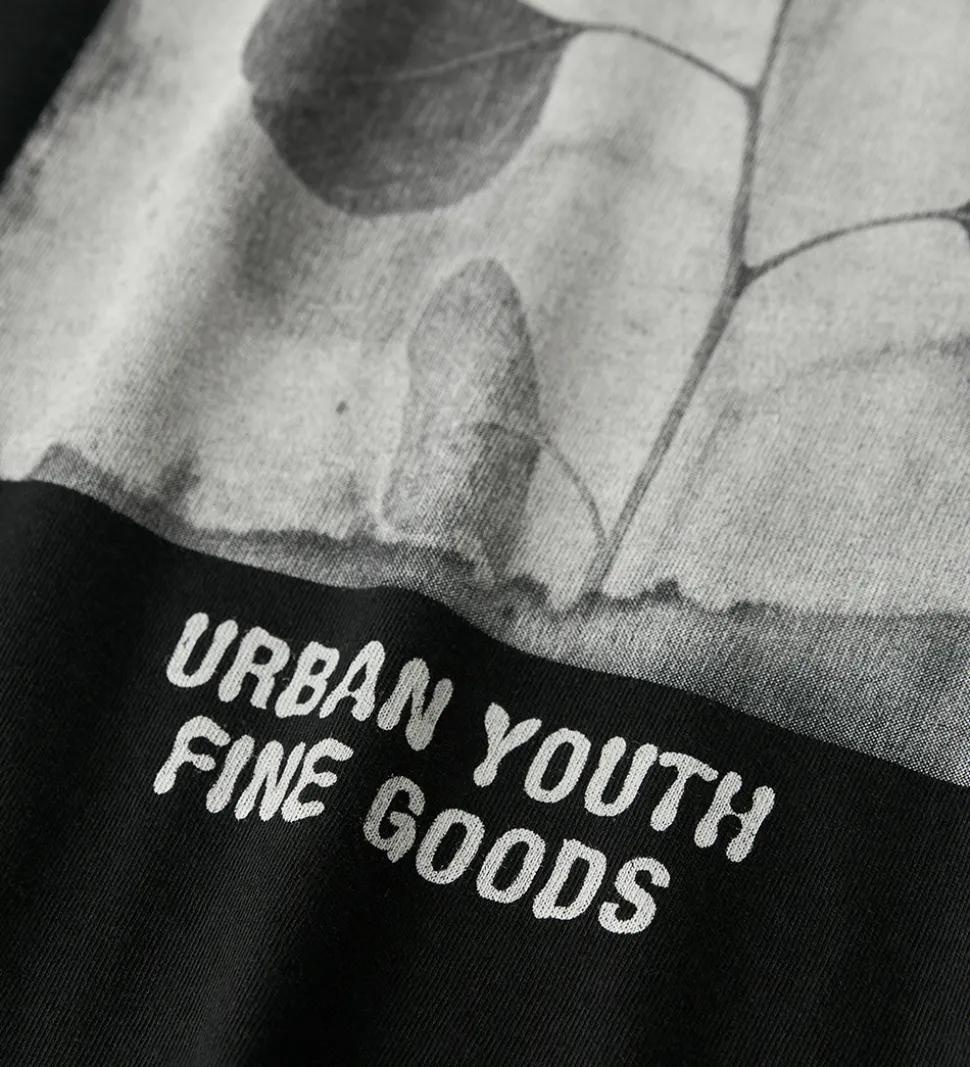 Flot Name It t-shirt i sort med teksten “Eco Warrior Positive Influencer” i hvid på venstre bryst. På ryggen er der et stort print med tekst og blade i grå nuancer. Name It t-shirten har en rund halsudskæring med en smal ribkant og korte ærmer.
