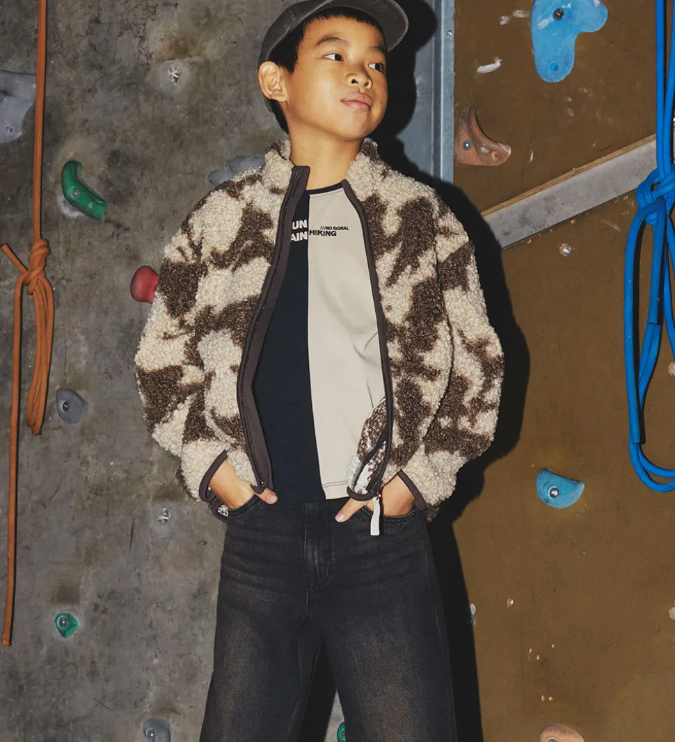 Stilfuld Name It t-shirt med et spændende todelt design i sort og beige. T-shirten har et unikt print med teksten “MOUNTAIN HIKING” og “NO SIGNAL”. Name It t-shirten har en rund halsudskæring med en diskret ribkant.