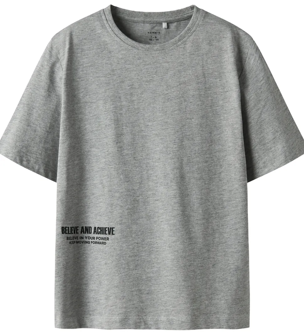 Stilfuld Name It t-shirt i gråmeleret med sort tekstprint foran på højre side samt på ryggen. T-shirten har en rund halsudskæring med en smal ribkant og korte ærmer.