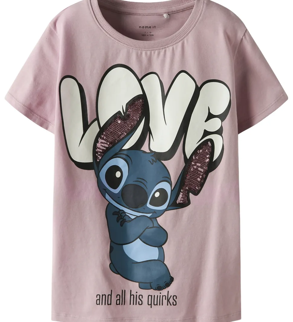 Smart Name It t-shirt i rosa med et stort print på fronten af Stitch med palietter på ørerne og teksten “Love”. Name It t-shirten har en rund halsudskæring med en smal ribkant og korte ærmer.