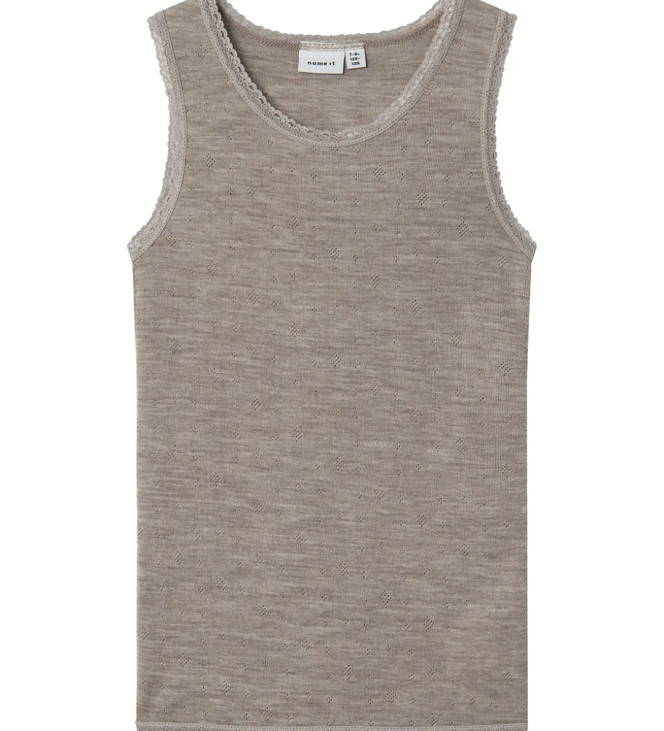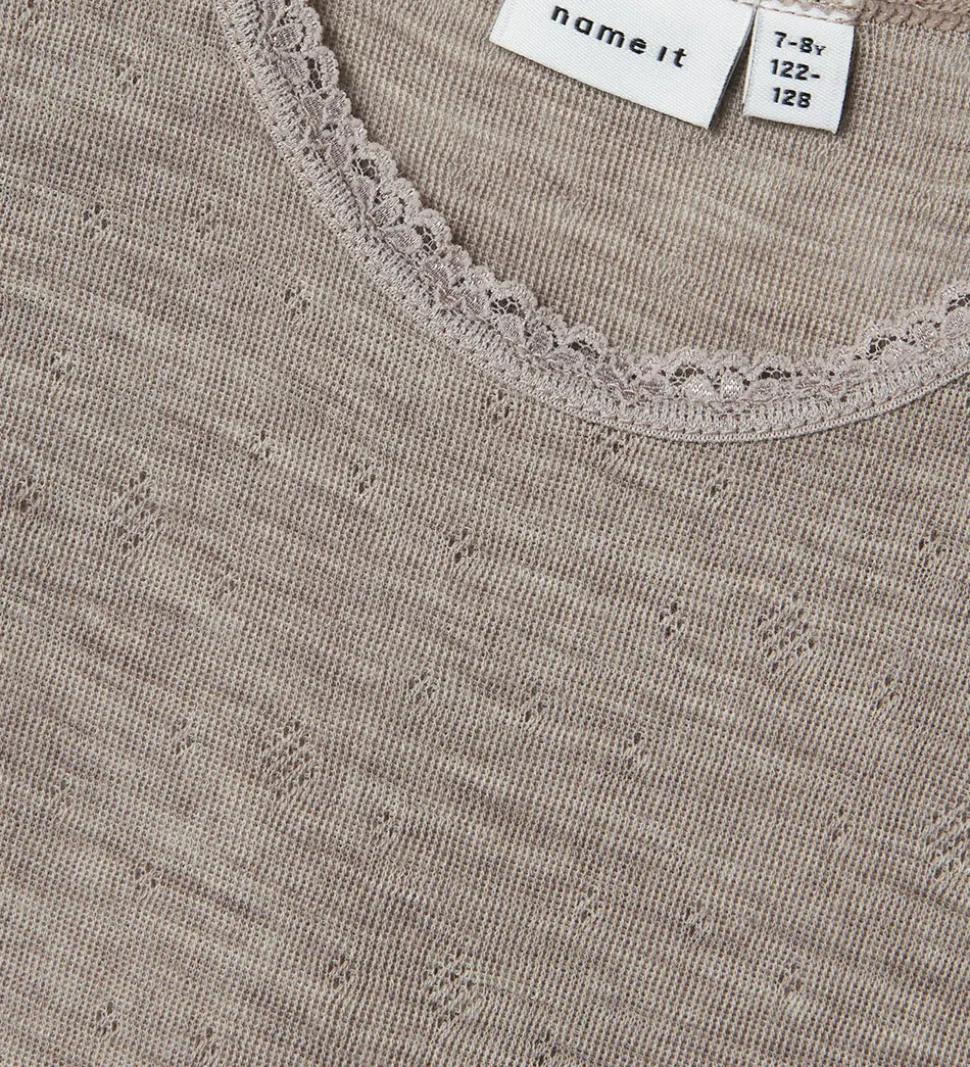 Behagelig Name It undertrøje med et fint hulmønster. Undertrøjen er lavet i en flot, brunlig nuance og har fine blonder langs kanterne, hvilket giver et ekstra pift til det enkle design. Struktur og farvevalg gør Name It undertrøjen både stilfuld og praktisk. Undertrøjen er fremstillet af lækkert merinould.