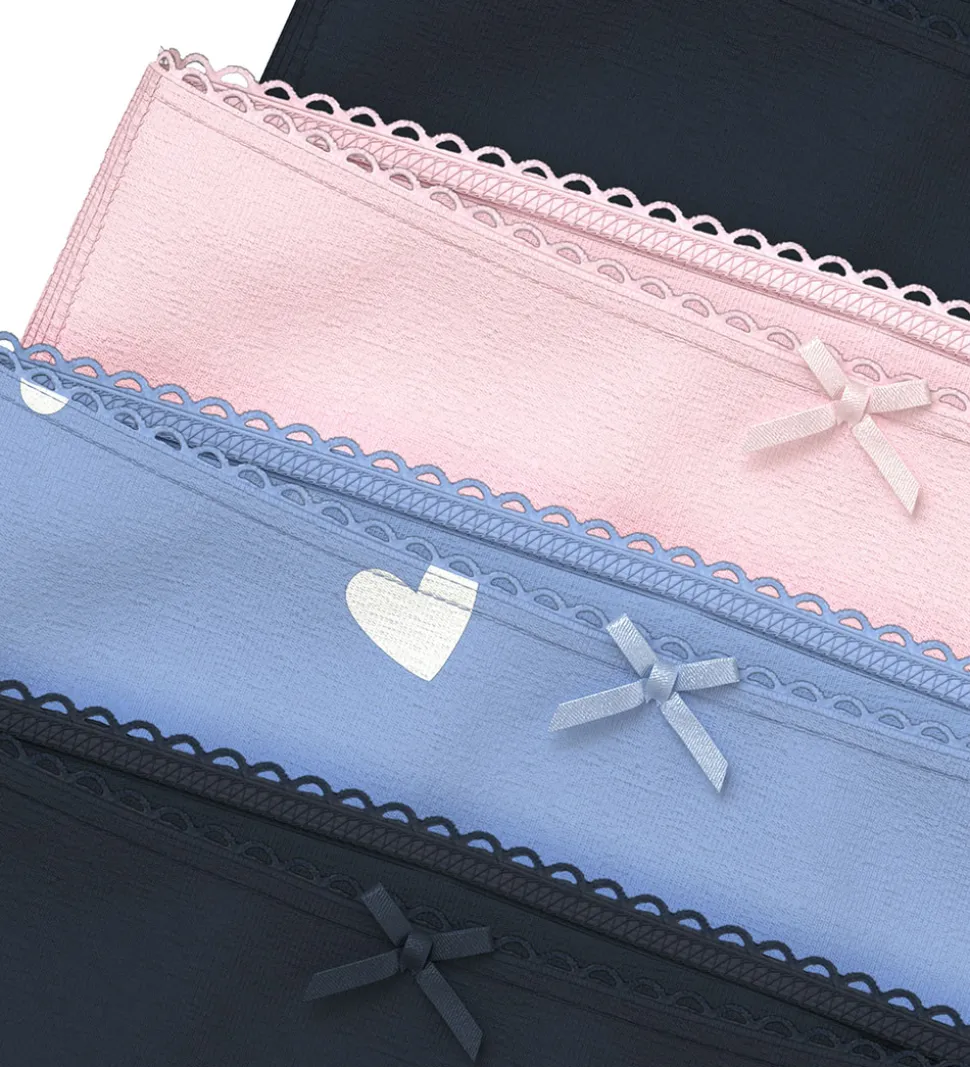 Trusserne har blondekant og en lille sløjfe fortil, og de passer godt ind i hverdagens garderobe.