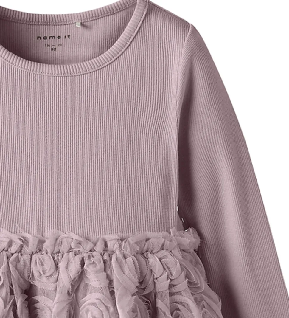 Sød Name It kjole i ensfarvet rosa. Name It kjolen har lange ærmer, og toppen er lavet af blødt bomuld med rbstruktur. Nedenunder falder tylskørtet med masser af vidde, og det er dekoereret med massvis af roser lavet af tyl.
