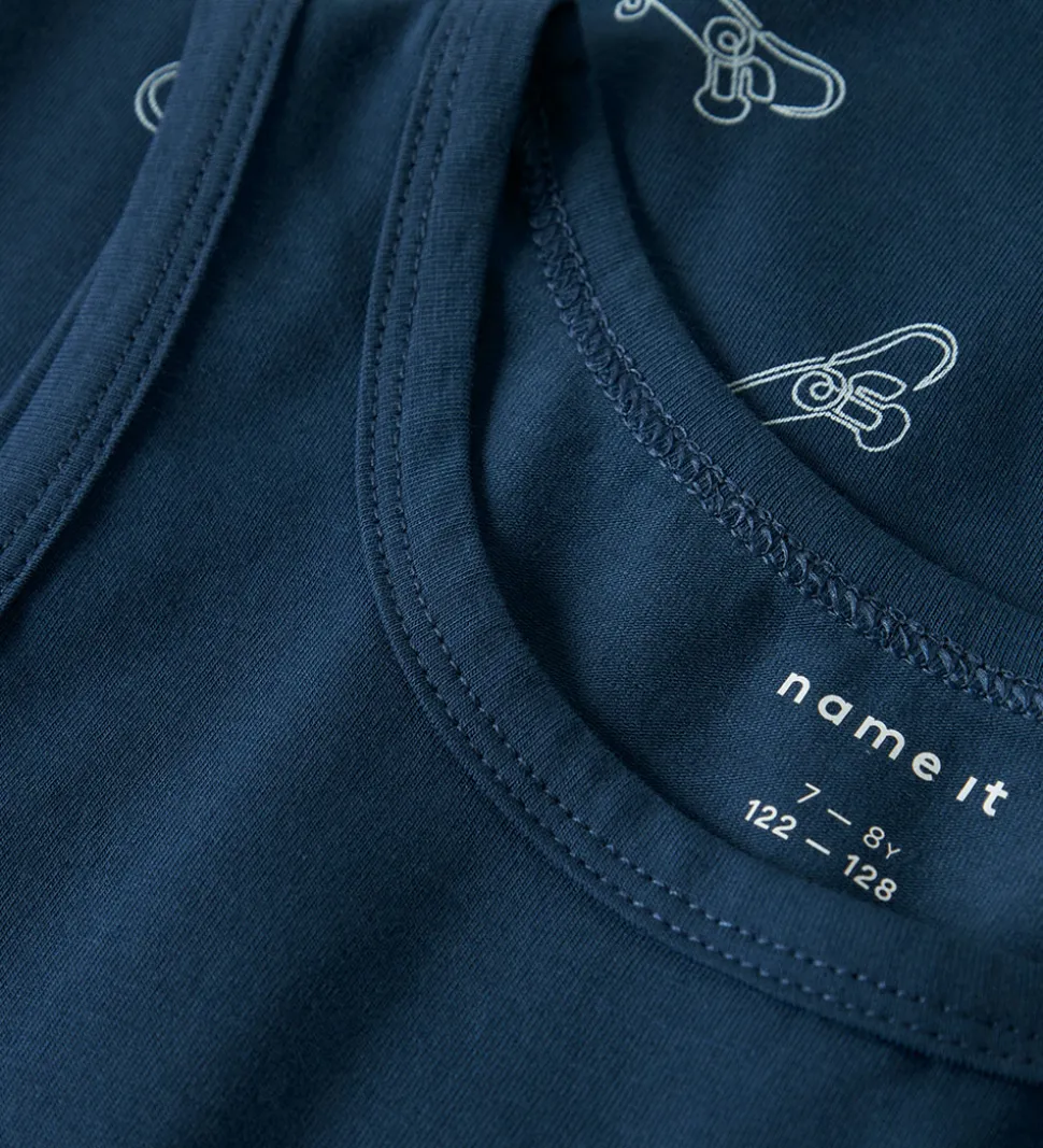 Smarte Name It undertrøjer i en 2-pak. Den ene undertrøje er ensfarvet mørkeblå, mens den anden har et mønster med hvide skateboardmotiver på en mørkeblå baggrund.