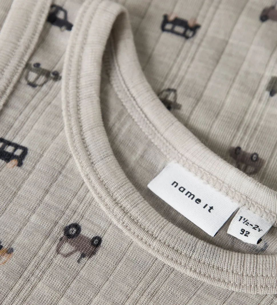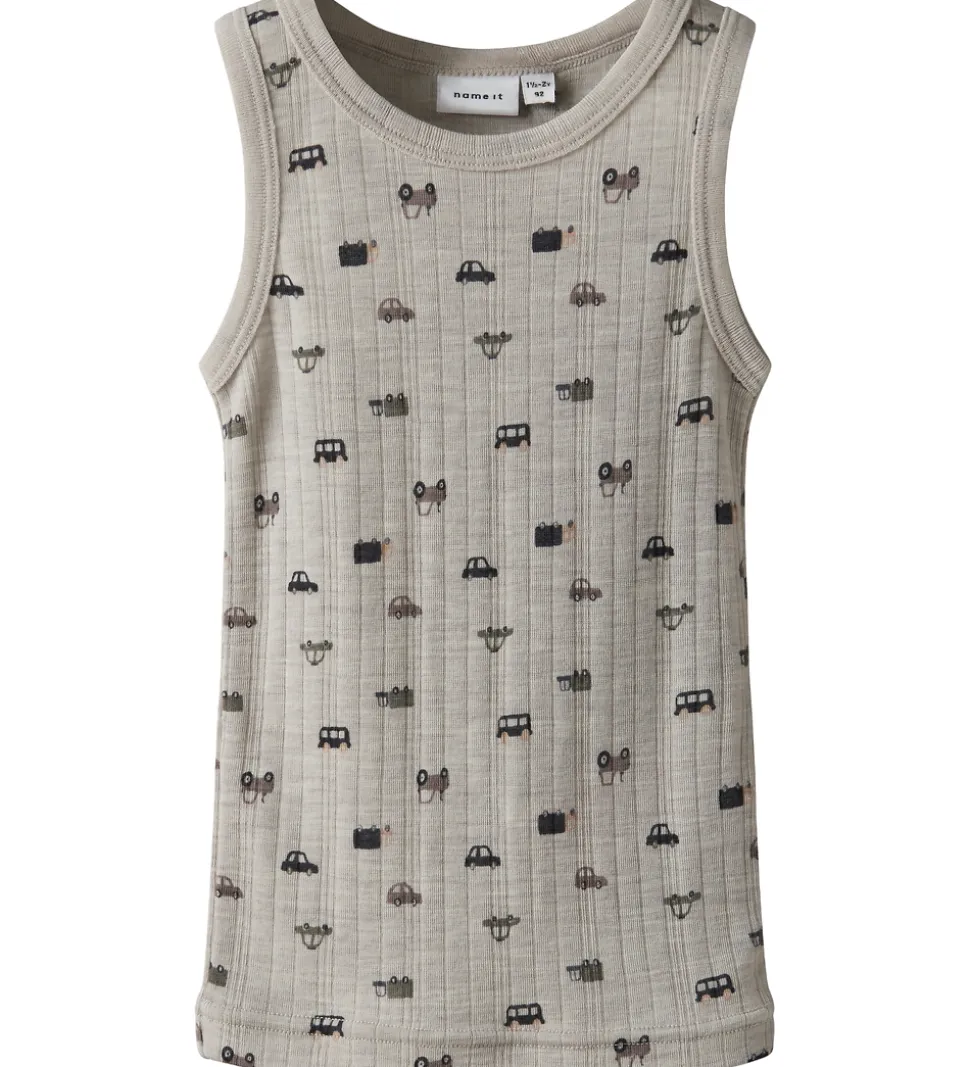 Skøn Name It undertrøje i lys gråbeige med fin ribstruktur og med print af biler i blå, grønne og brune nuancer. Undertrøjen har en rund halsudskæring og brede skulderstropper. Den er fremstillet i blødt og åndbart merinould.