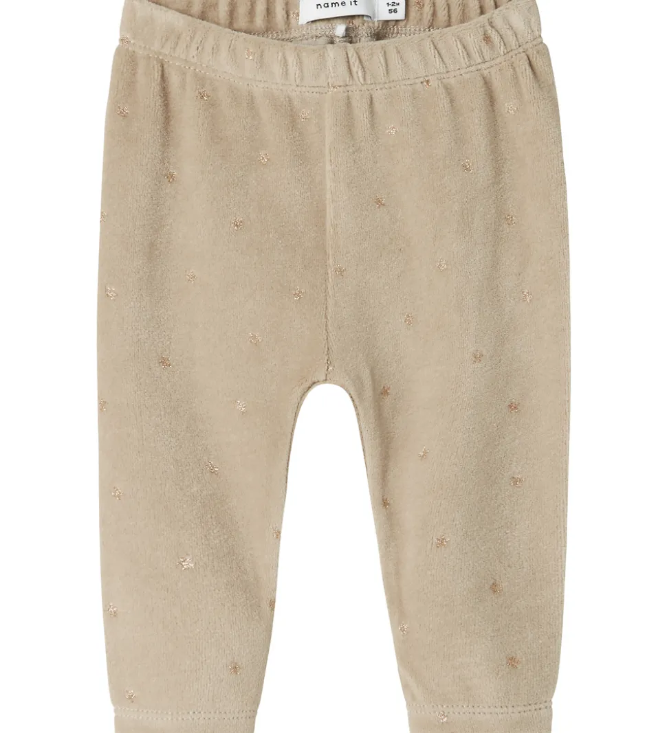 Lækre Name It velourbukser i beige med små stjerner i guld. Bukserne har en tætsiddende pasform med en god elastik i taljen.