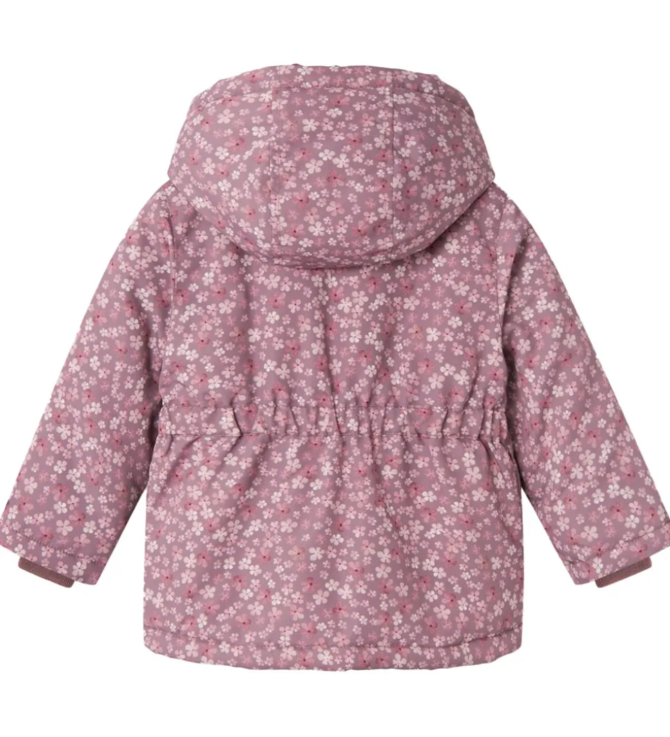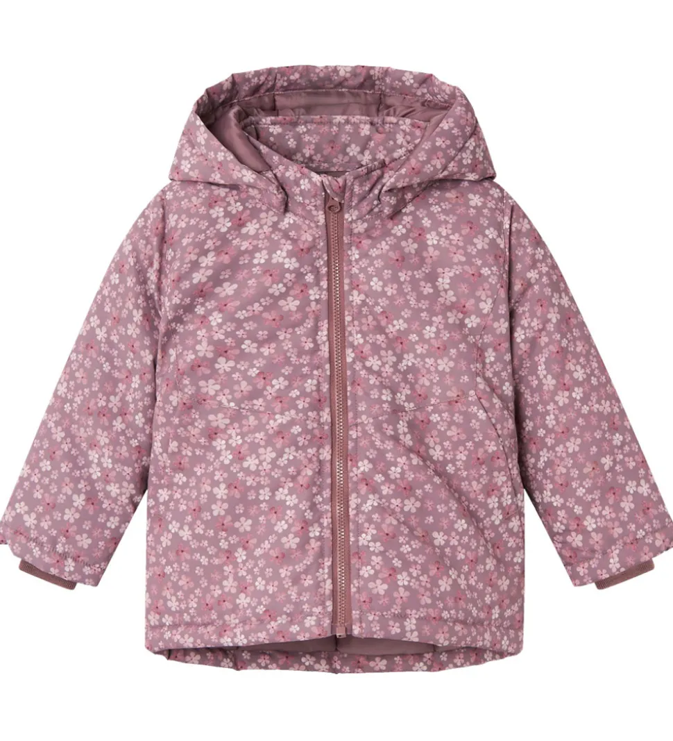 Smuk Name It vinterjakke i en fin lilla farve med et flot blomsterprint i lyserøde og hvide nuancer.