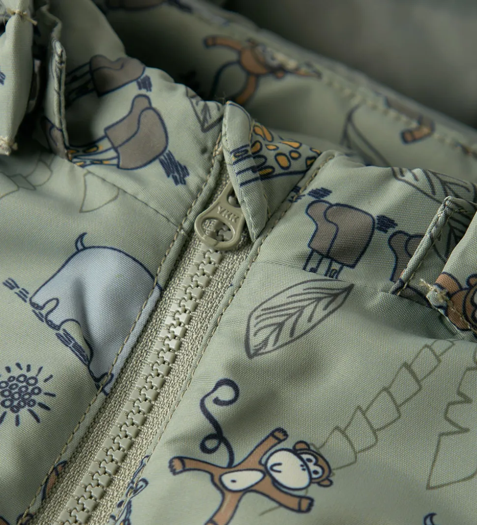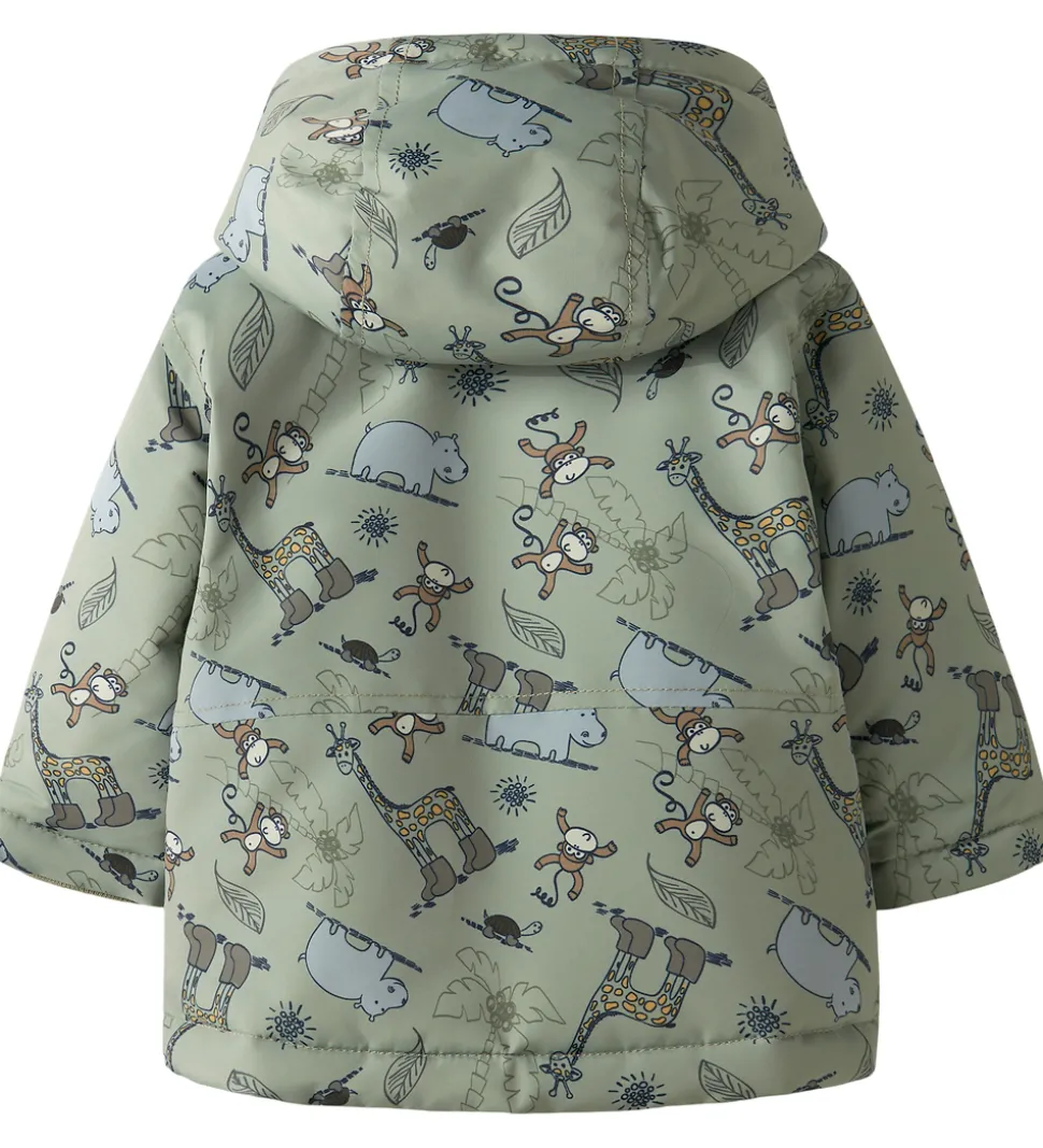 Smuk Name It vinterjakke i støvet grøn og med et sjovt dyreprint.