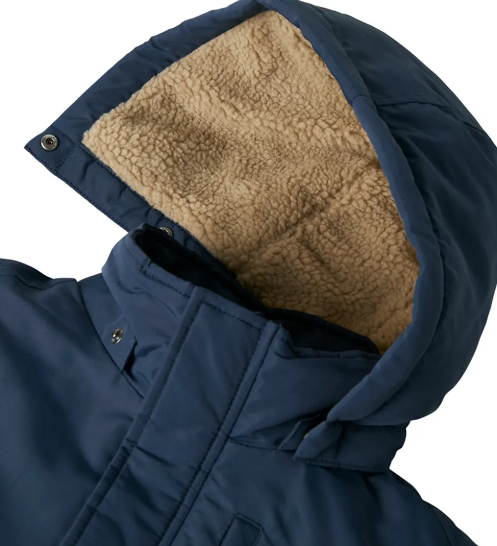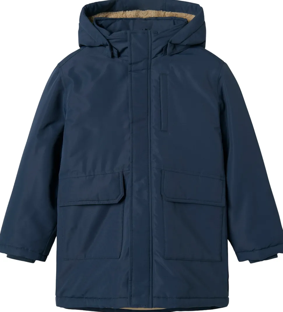 Stilfuld Name It vinterjakke i en flot mørkeblå nuance og med for af beige teddyfleece. Vinterjakken har en praktisk hætte og rummelige lommer, der gør den både funktionel og moderne. Ærmerne har snefang og ribkanter. Name It vinterjakkenjakken er ideel til de kølige årstider.