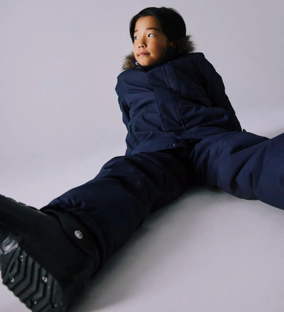 Name It vinterjakken har en aftagelig hætte, som sidder fast med skjulte trykknapper omkring halskraven, og pelskanten kan tages af og på ved hjælp af små knapper, og på indersiden er der et elastikkant, så hætten sidder godt til hovedet. Ærmerne har praktiske snefang med et hul til tommelfingeren, og ærmekanterne kan strammes ind med velcro. Omkring livet er der et praktisk snefang med gummi, som lukkes med to trykknapper. Vinterjakken er godt vatteret, og indvendig har den et glatvævet for.