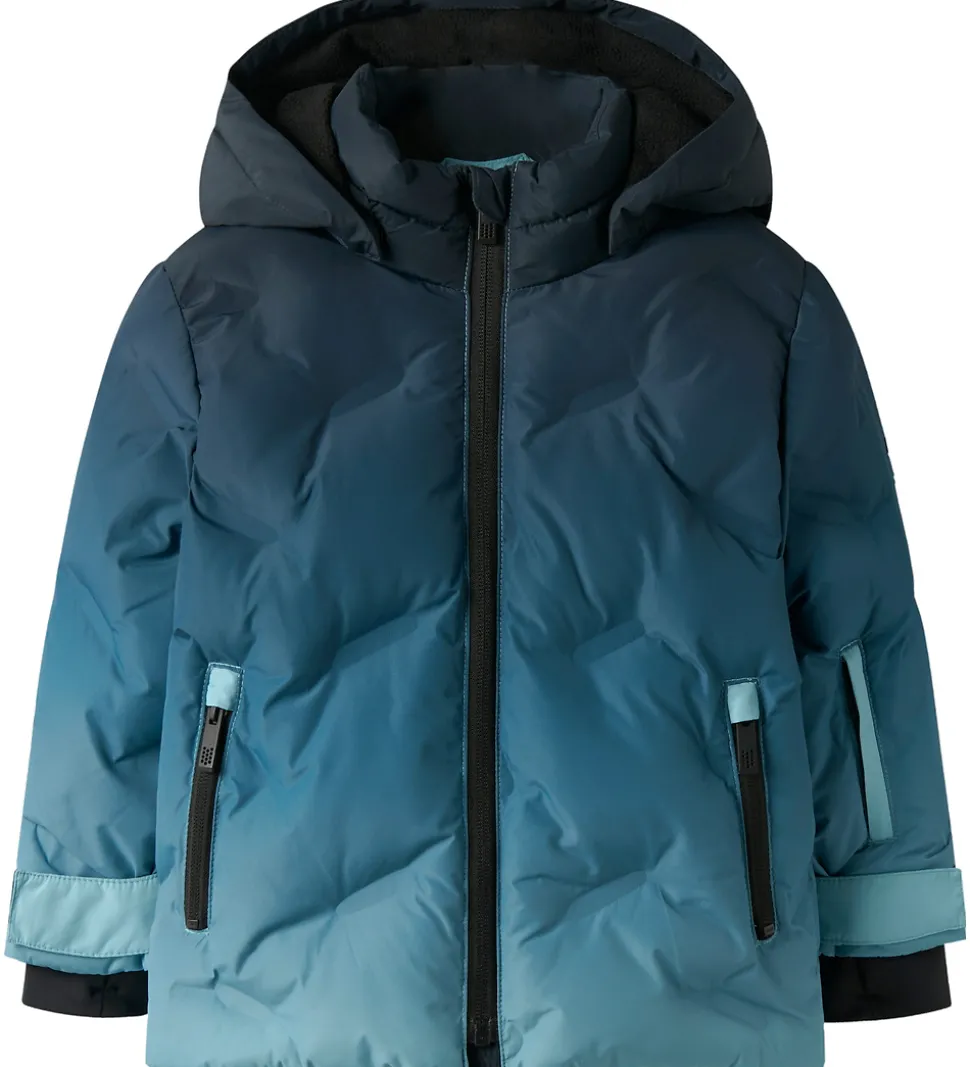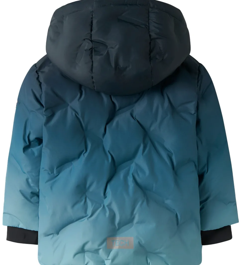 Smart Name It vinterjakke i gradurende farve fra navyblå til lyseblå. Vinterjakken har en refleksdetalje nederst på ryggen.