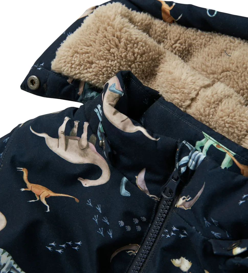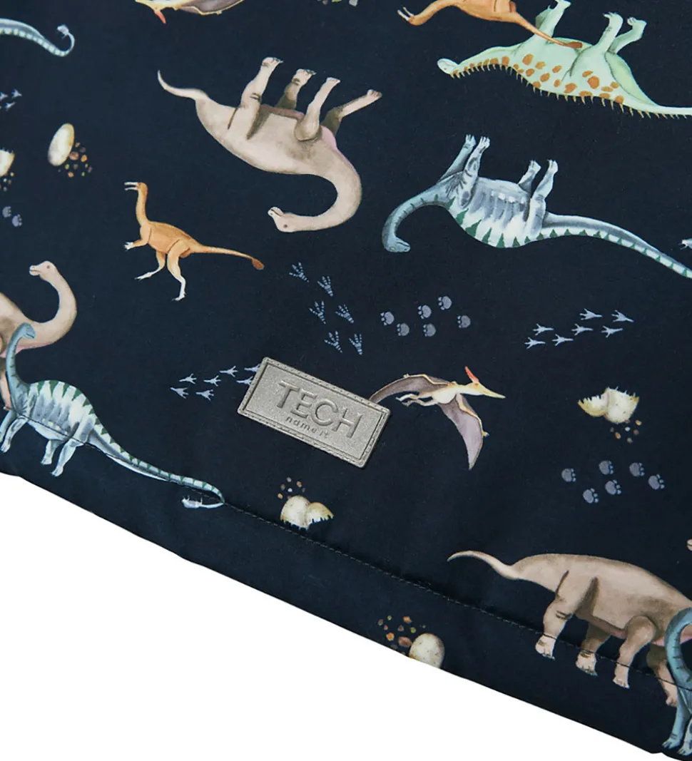 Flot Name It vinterjakke i navyblå med et farverigt alloverprint af dinoer. Vinterjakken har velplacerede reflekspipings og reflekser.