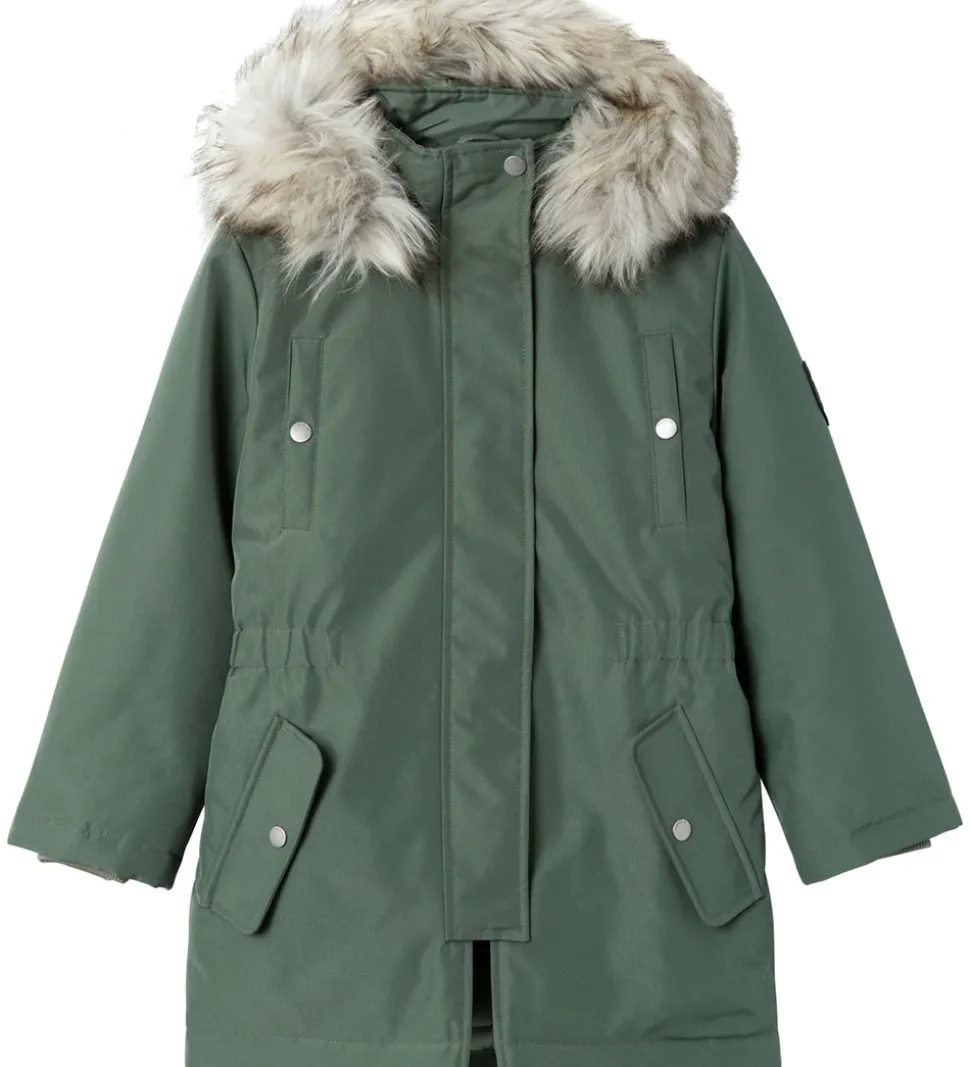 Dejlig Name It vinterjakke i agave-grøn med en lækker kant af imiteret pels på hætten.