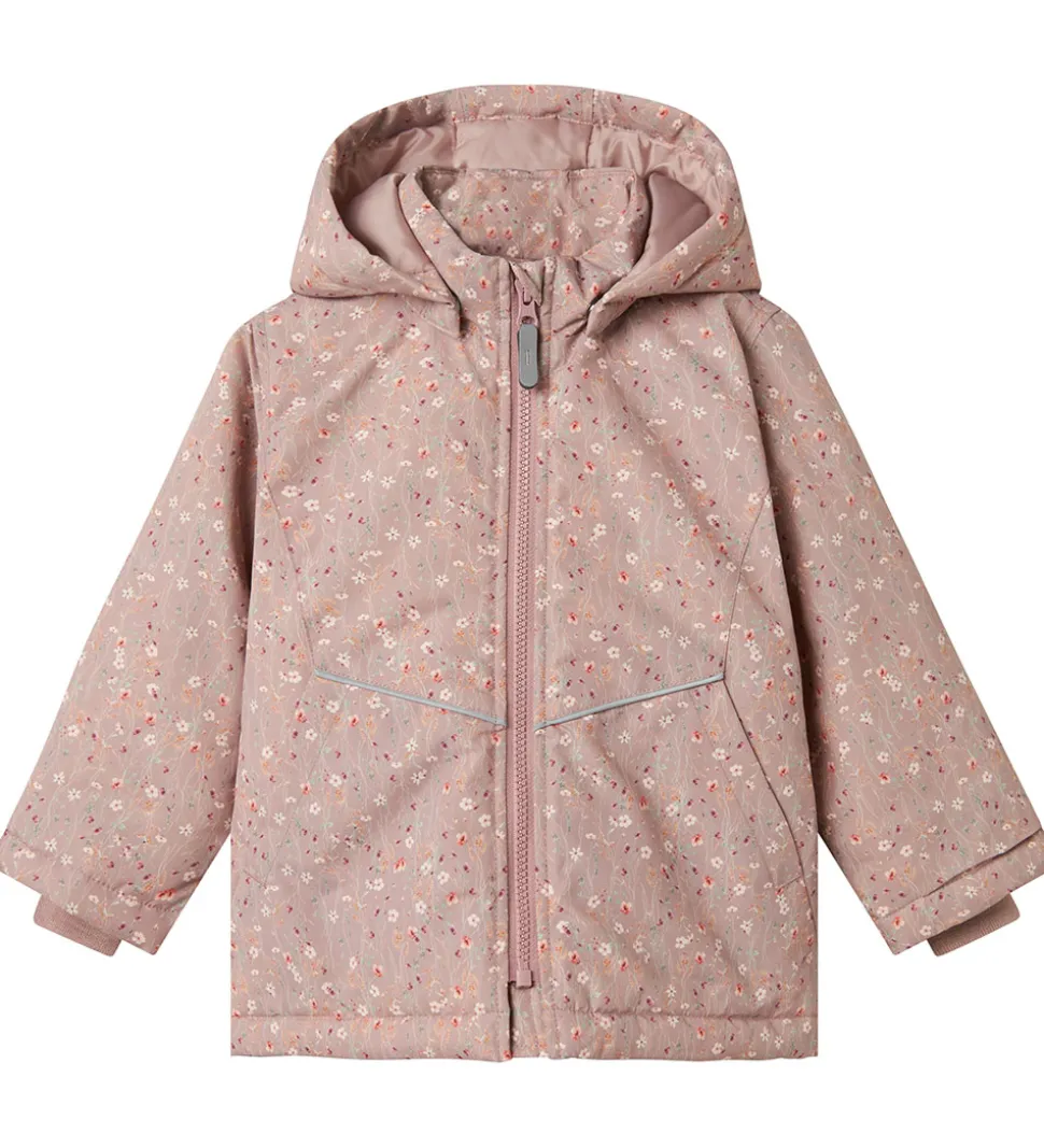 Smart Name It vinterjakke i en afdæmpet rosa nuance og med et smukt blomstermønster over det hele, som skaber et elegant udtryk.