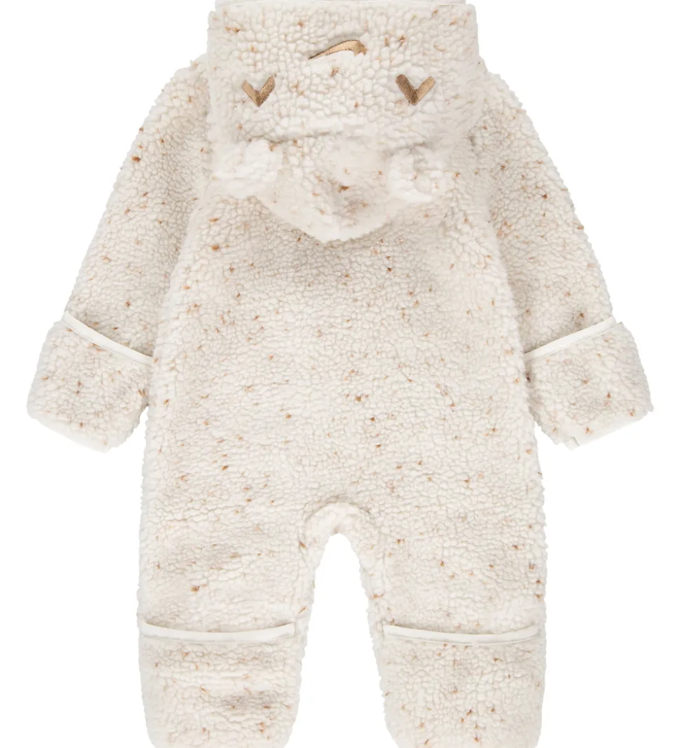 Charmerende fleecedragt fra Nike i en råhvid nuance med bittesmå beige nister, der tilføjer et delikat touch. Nike fleecedragten har en hætte udsmykket med søde øre-detaljer og påsyede grafikker. Den er designet med lange ærmer og ben. Fleecedragten har en praktisk lynlås med hagebeskytter foran, hvilket gør det nemt at få den af og på. På ærmer og ben har dragten ombuk, som holder hænder og fødder varme.