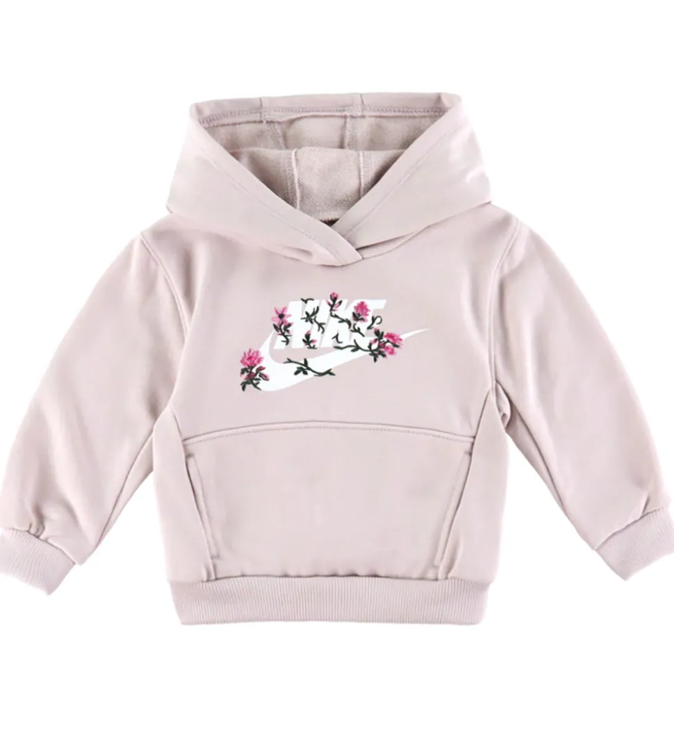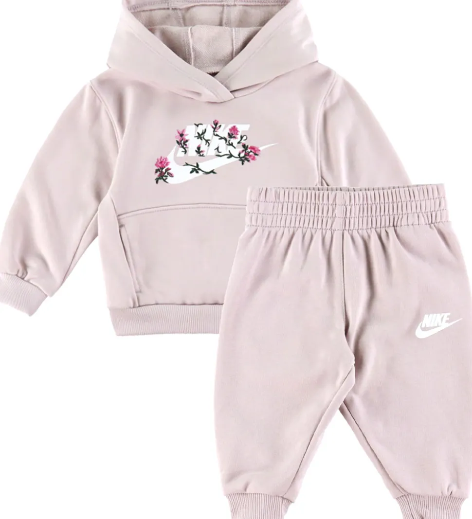 Stilrent Nike sweatsæt i en flot lyserød nuance. Overdelen er en hættetrøje med det ikoniske Nike-logo dekoreret med fine blomsterdetaljer. Fortil sidder der en stor kængurulomme. Sweatpantsene har en elastisk kant i taljen og afsluttes med ribkanter ved anklerne. Begge dele fremstår i en blød kvalitet, der giver en let og bekvem følelse. Nike sweatsæt kombinerer enkelt design med diskrete detaljer.