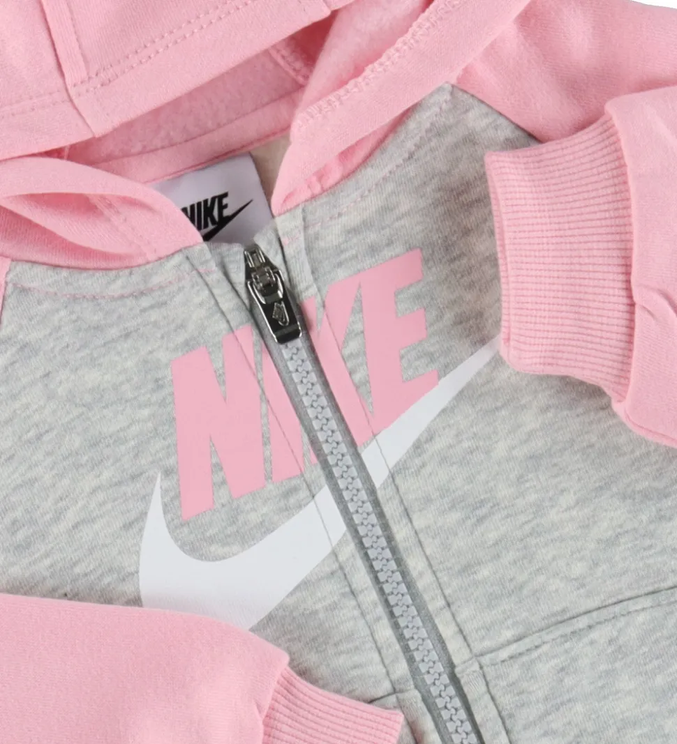 Fint Nike sweatsæt bestående af en cardigan og et par sweatpants i gråmeleret og rosa sweat med hvide detaljer samt en hvid t-shirt med et logoprint.