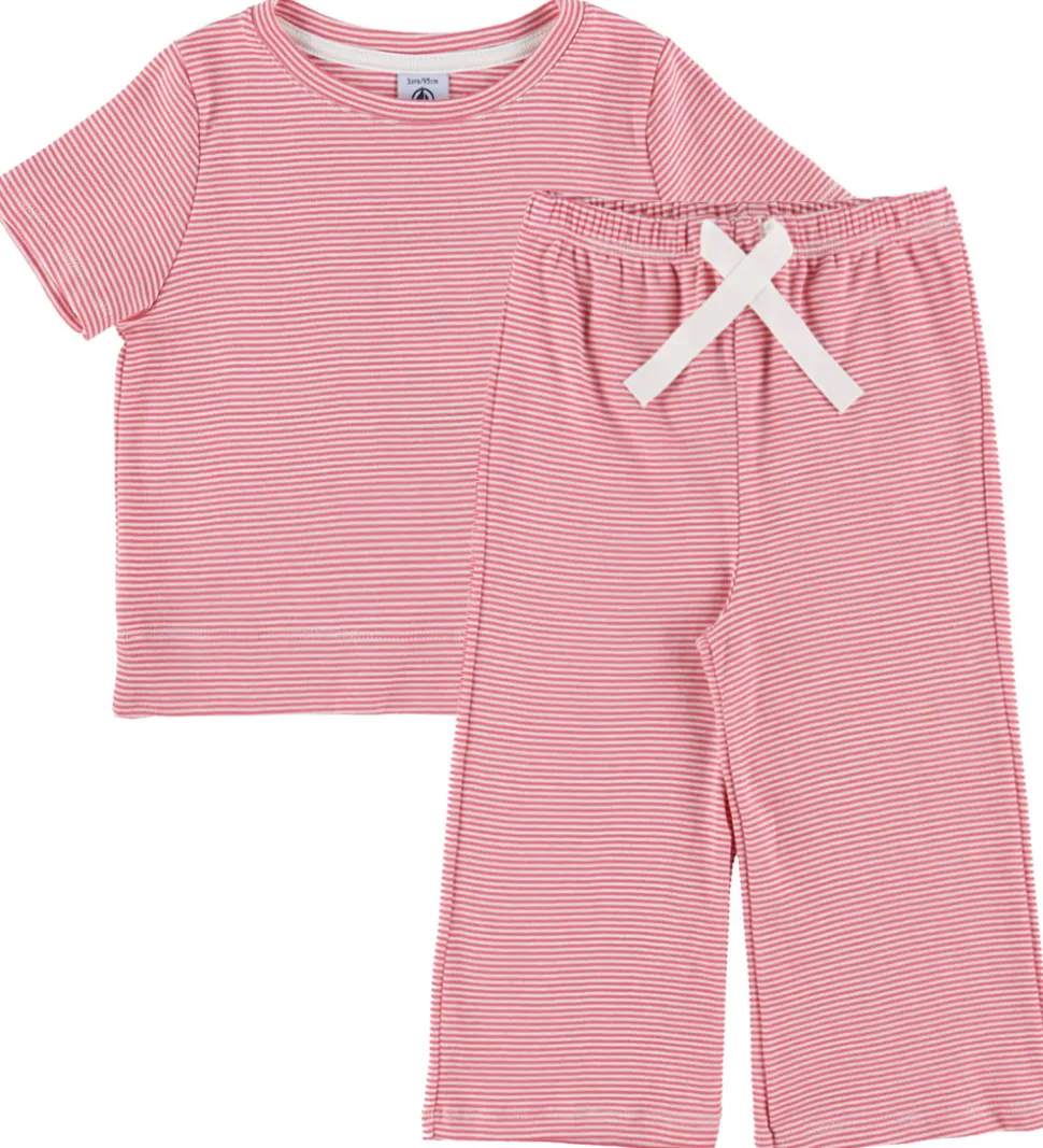 Behageligt Petit Bateau nattøj 2-delt sæt bestående af en stribet t-shirt med korte ærmer i pink og hvid. Matchende bukser med elastisk talje og dekorativt bindebånd fuldender det stilfulde look.