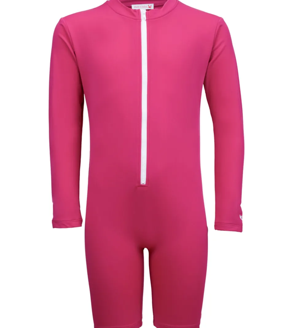 Smart Petit Crabe badeheldragt i en dyb rosa, med et broderet logo på venstre ærme, samt en hvid lynlås.