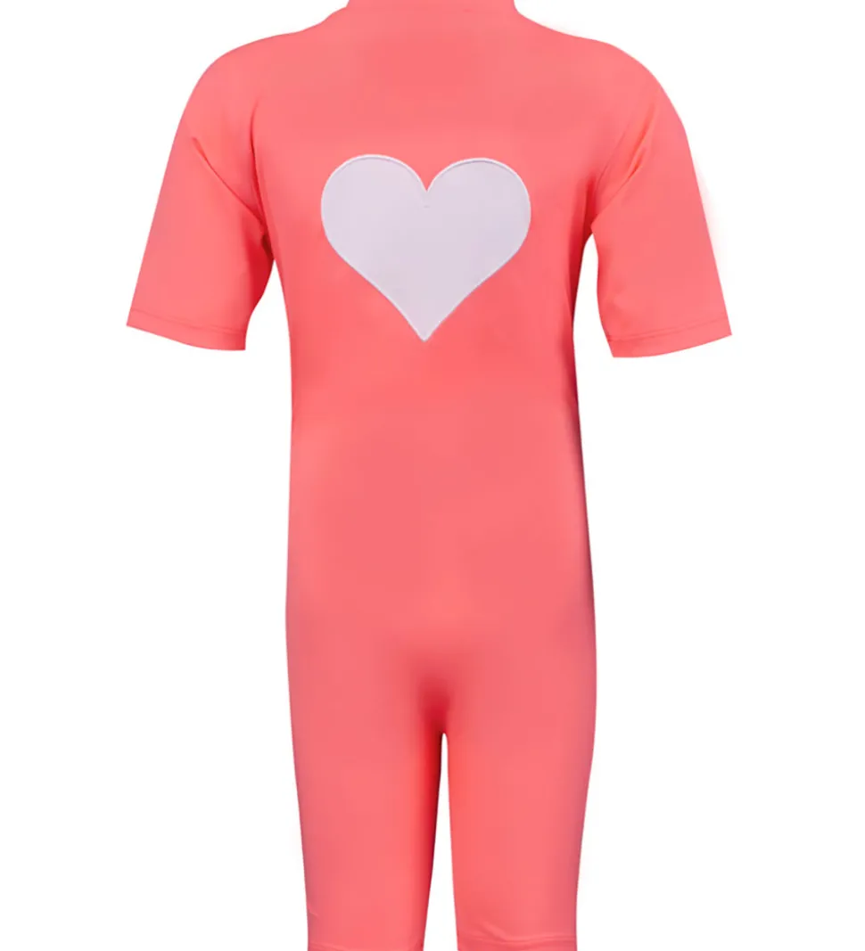 Smart Petit Crabe badeheldragt i koral med et stort, hvidt hjerte på ryggen.