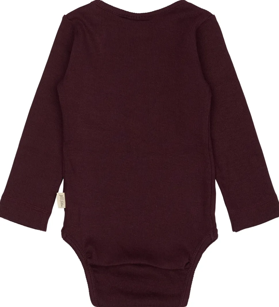 Elegant Petit Piao body med lange ærmer i en dyb bordeauxrød nuance. Den ribstrikkede struktur giver et klassisk udtryk, der skaber et tidløst design. Bodyen fra Petit Piao er forsynet med praktisk trykknaplukning i bunden, hvilket gør det nemt ved bleskift.