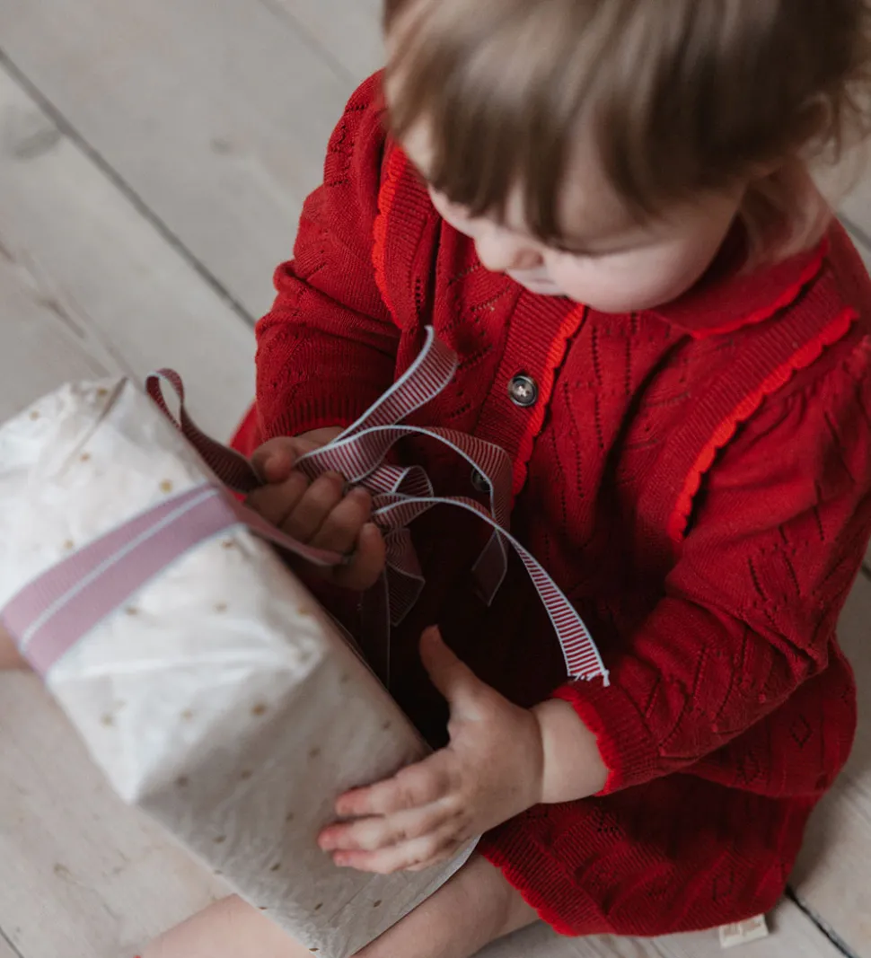 Elegant kjole fra Petit Piao med en dyb rød farvetone. Kjolen er strikket med et fint hulmønster på kroppen og ærmerne, samt en dekorativ krave. Foran er der knapper, som tilføjer et klassisk look. Petit Piao kjolen er prydet med fine strikkede detaljer, der giver et sofistikeret udtryk.