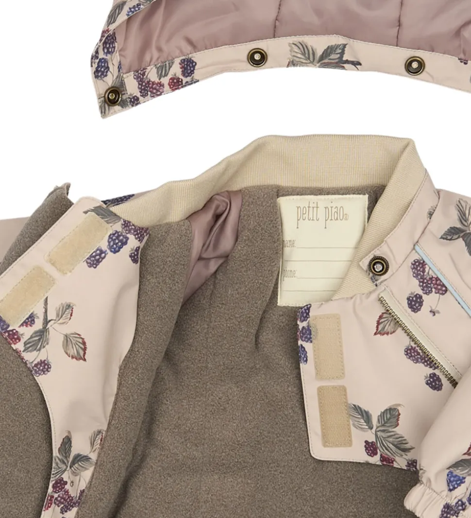 Skøn Petit Piao vinterjakke i beige med et alloverprint af brombær. Vinterjakken er med praktiske reflekspipings og et broderet logo fortil.