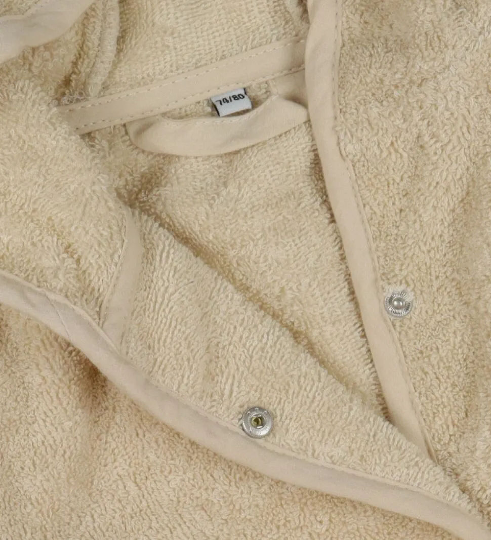 Smart Pippi Baby badekåbe i beige, med en fastsyet hætte udformet som en ræv, med store ører.