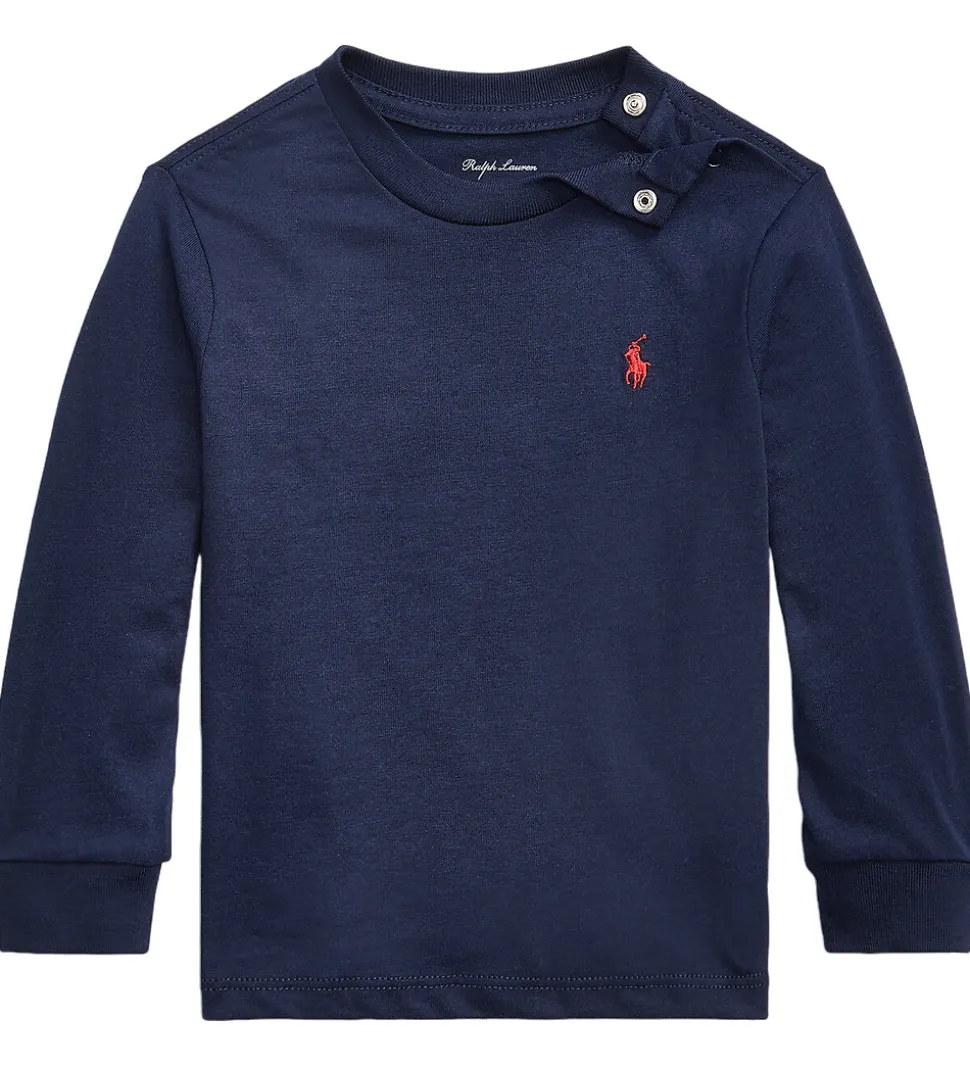 Elegant bluse fra Polo Ralph Lauren i en dyb navy farve. Blusen har lange ærmer og er prydet med det ikoniske røde Polo Ralph Lauren logo broderet på brystet. Den runde halsudskæring er forsynet med praktiske trykknapper på skulderen. Stoffet har en flot og enkel struktur, der passer til et stilrent udseende.