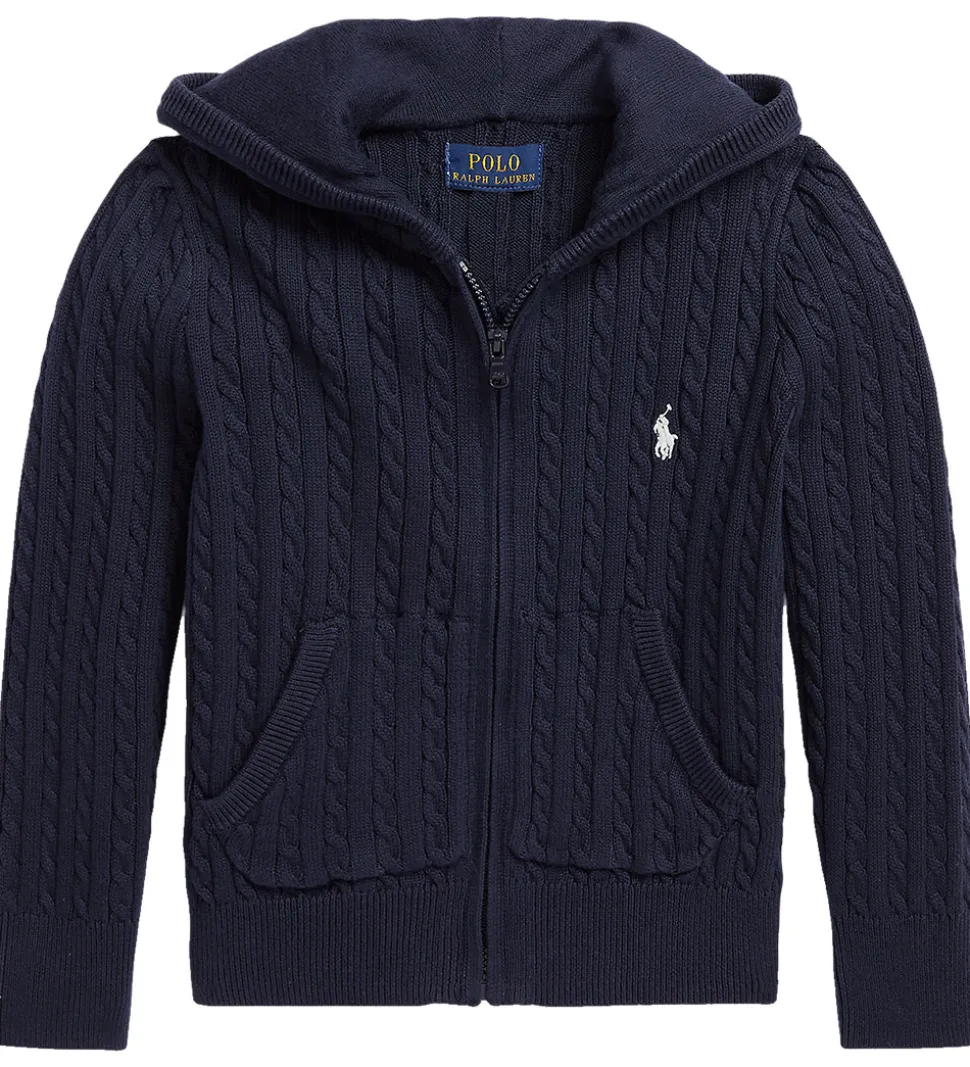 Polo Ralph Lauren cardiganen har en fast hætte med et glatstrikket for, og cardiganen har brede ribkanter. Den åbnes med en skjult lynlås, og fortil er der praktiske lommer.