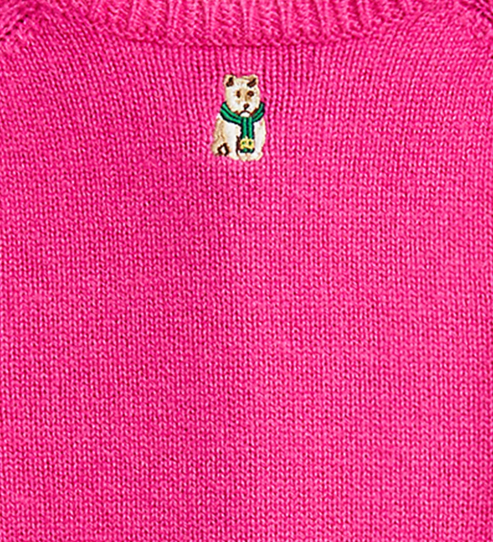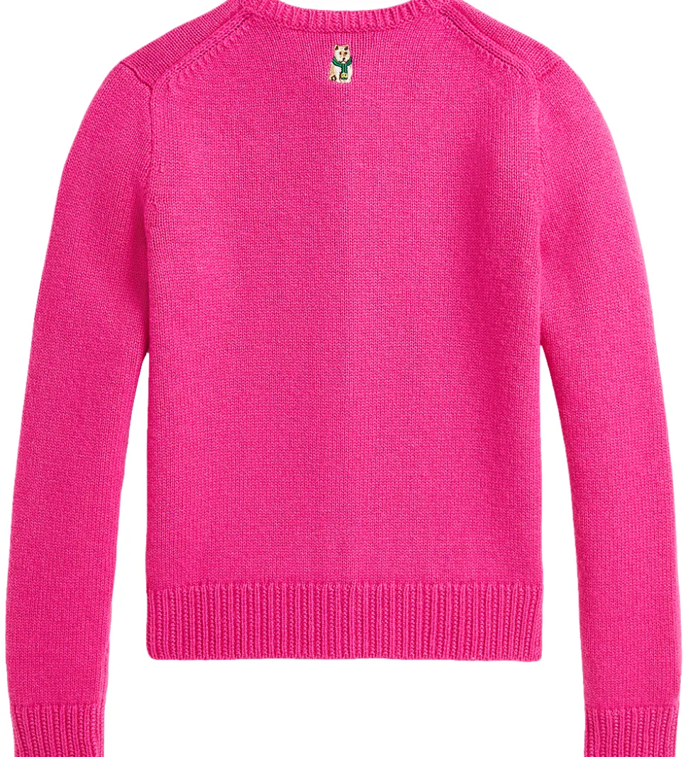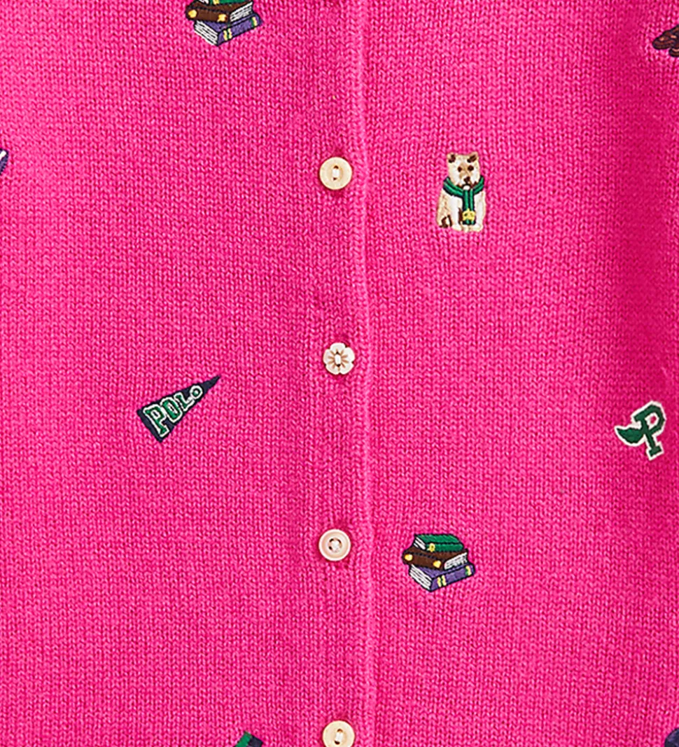 Smart Polo Ralph Lauren cardigan i pink, og fortil er der broderet forskellige figuret som en stabel bøger, et par sokker og en hund
