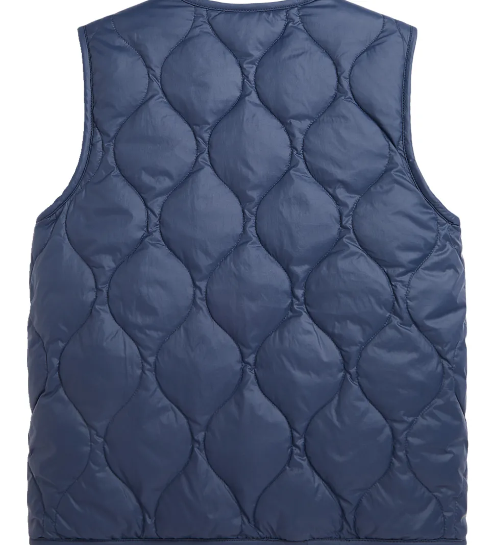 Lækker Polo Ralph Lauren dunvest med et vendbart design. På de neene side er den ensfarvet navy i et glatvævet materiale med en quiltet struktur samt et lille, orange logo broderet i venstre side. På den anden side er den ensfarvet beige og lavet af teddyleece med et lille, armygrønt logo broderet i venstre side.