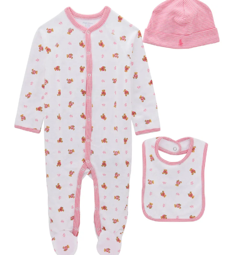 Sødt Polo Ralph Lauren gavesæt, der består af en heldragt, en hue og en hagesmæk. Heldragten og haagesmækken er hvid med et print med små brune bamser med pink tøj på, og huen har smalle striber i pink og hvid,