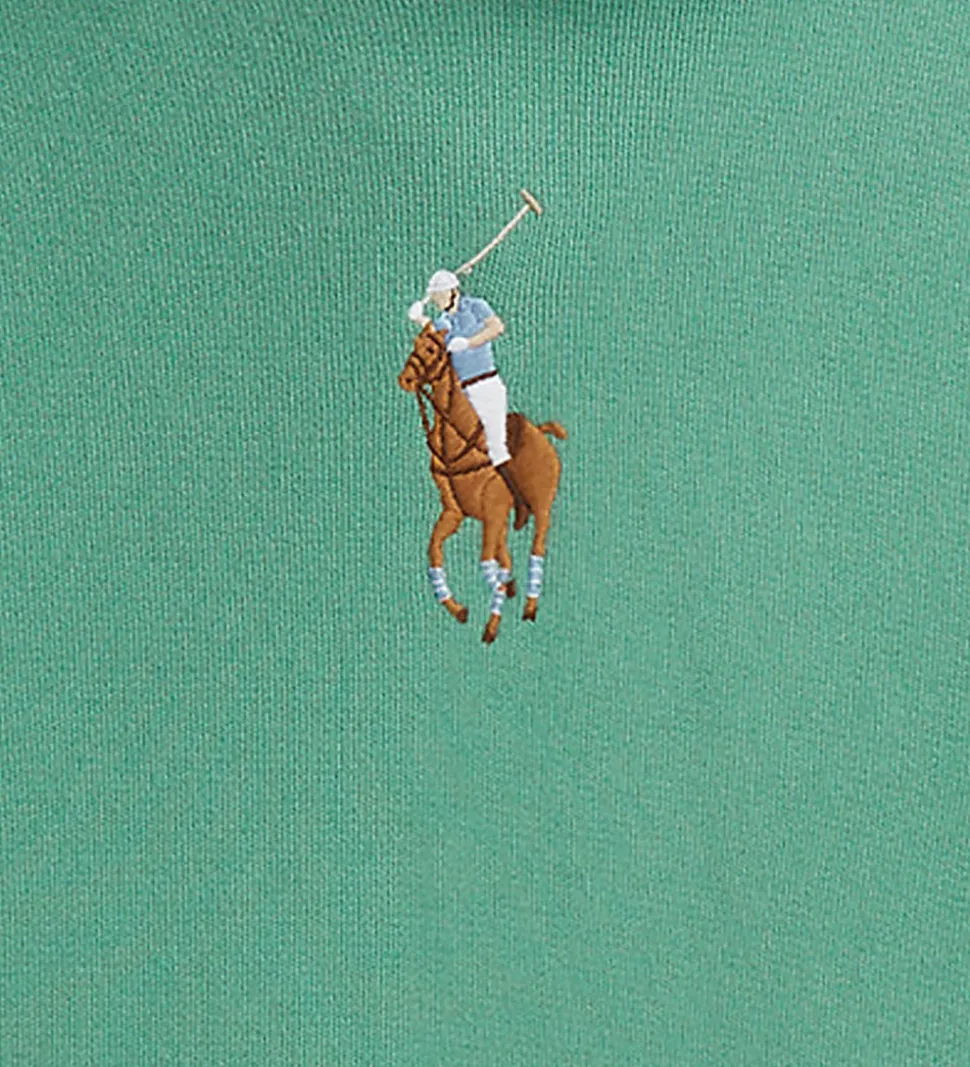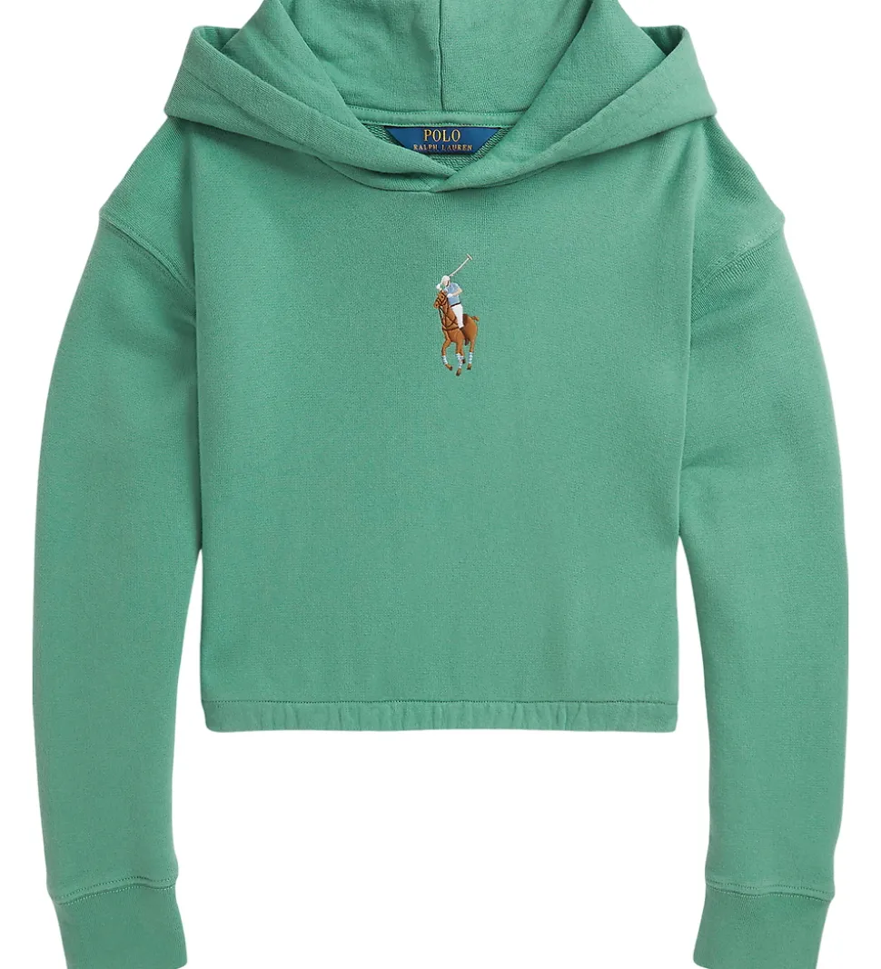 Elegant hættetrøje fra Polo Ralph Lauren i grønt sweat. På brystet er der et udsøgt broderi af Polo Ralph Lauren-logoet med rytteren, der tilføjer et klassisk touch. Hættetrøjen har lange ærmer og en let cropped pasform med elastik i livet, hvilket giver et moderne udtryk.