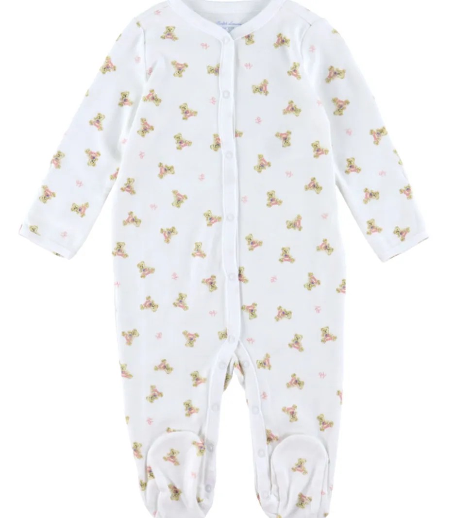 Sød Polo Ralph Lauren heldragt i hvid med et print med små brune bamser med et amerikansk flag på maven.
