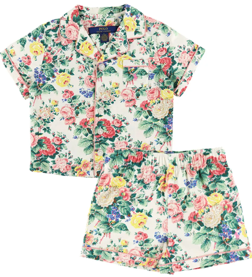 Sødt Polo Ralph Lauren nattøj, der består af et par natbukser og en natbluse i hvid med et blomstret mønster i rosa, lilla, gul og hvid og med blade i grønne nuancer. Nattøjet har rosa pipings, og det er lavet i en fastvævet kvalitet.