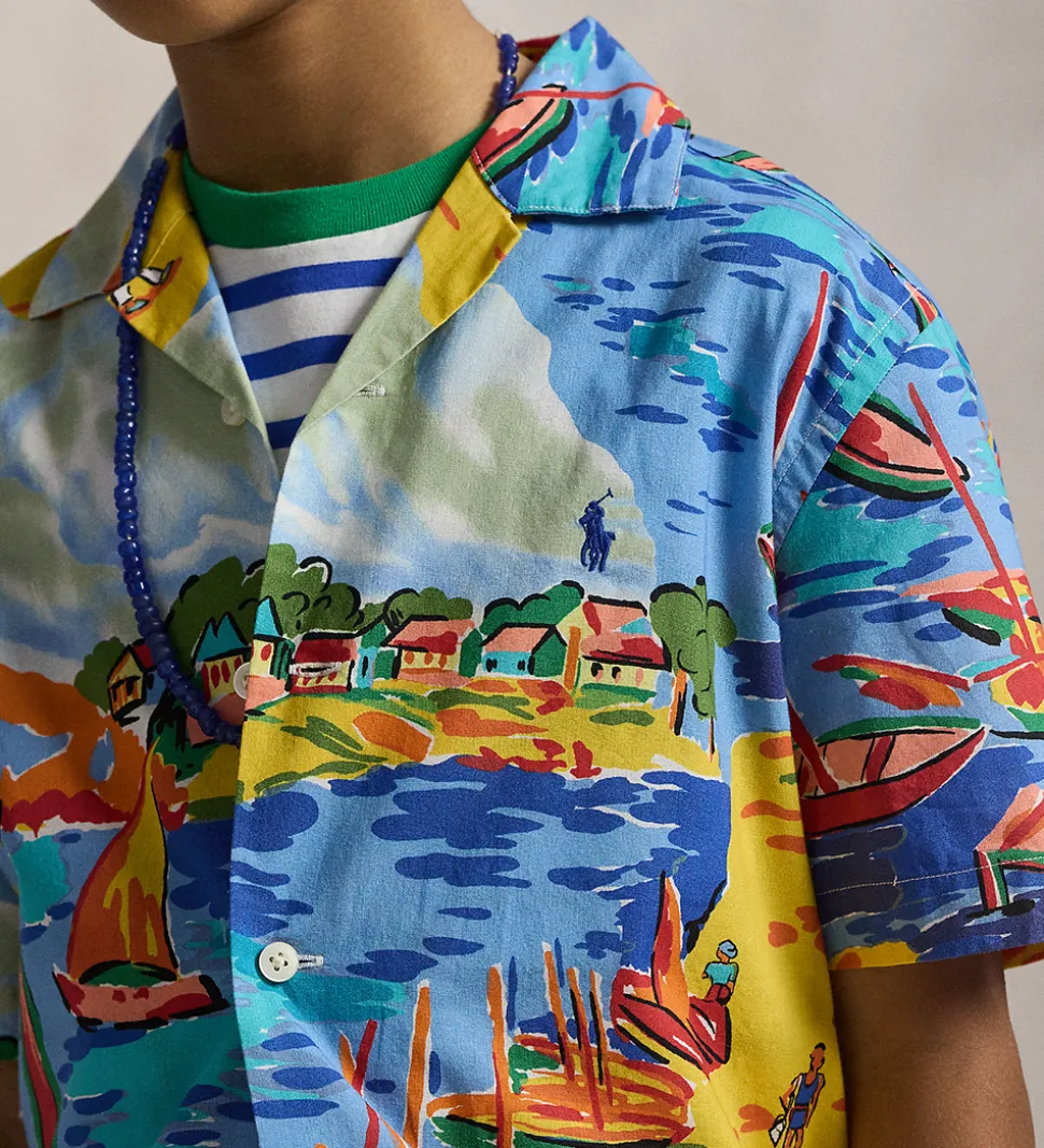 Sej Polo Ralph Lauren skjorte med et alloverprint med et sommermotiv med blåt vand og gult sand samt både og mennesker.