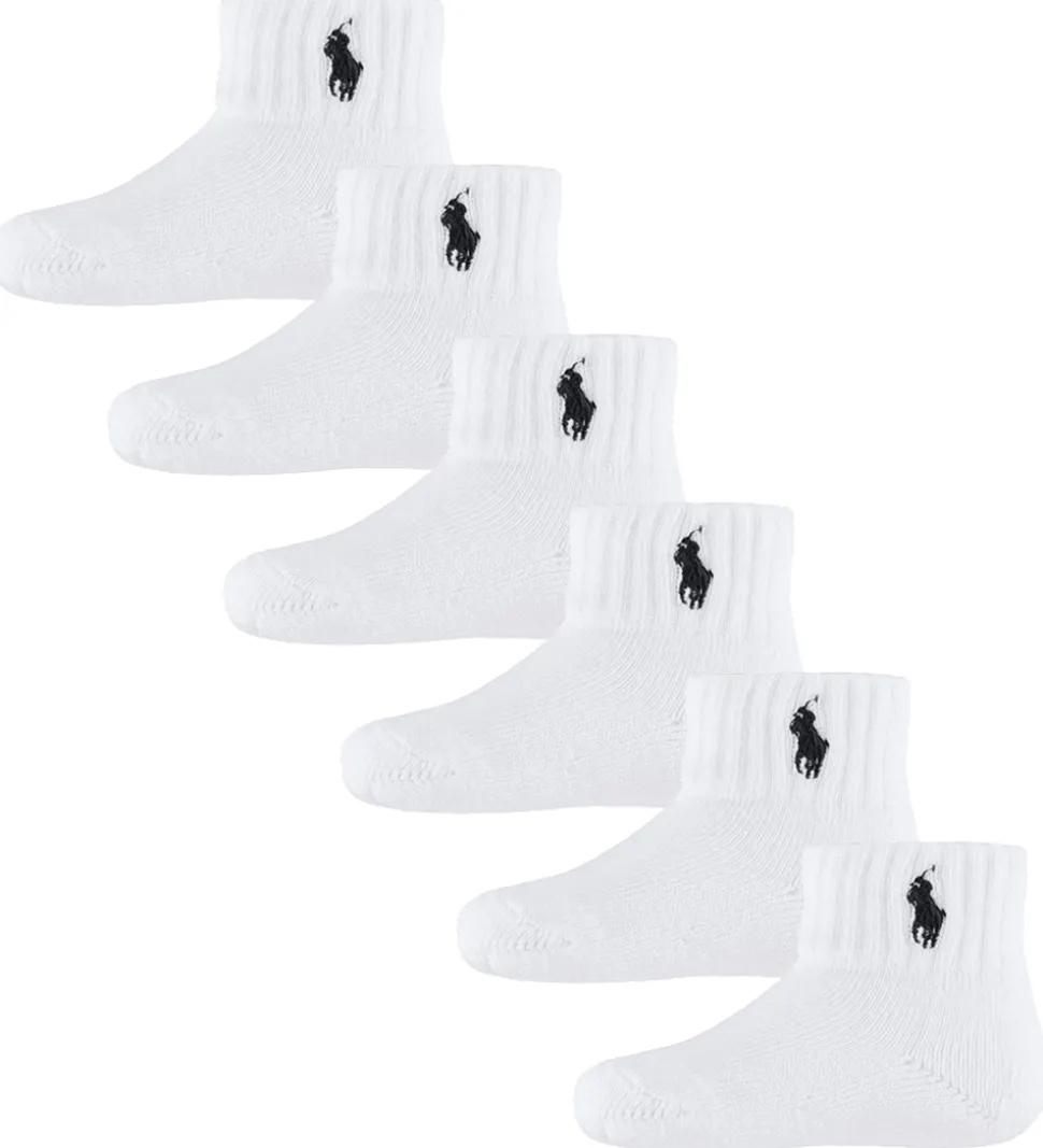 Fine Polo Ralph Lauren strømper solgt i en 6-pak i ensfarvet hvid. Strømperne har en broderet logo på skaftet i navy. Polo Ralph Lauren strømperne har en bred ribkant øverst, som sikrer en god pasform, og de har blødt frotté på indersiden.