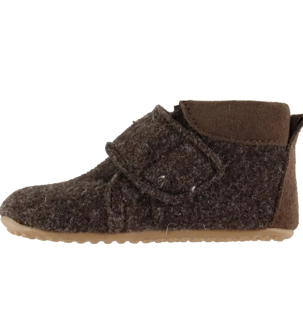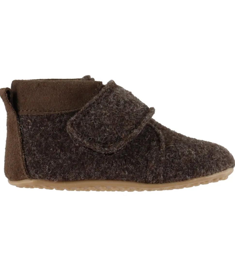 Smarte Pom Pom hjemmesko i mørkebrunt uld, med en fin detalje af brunt ruskind på hælen.