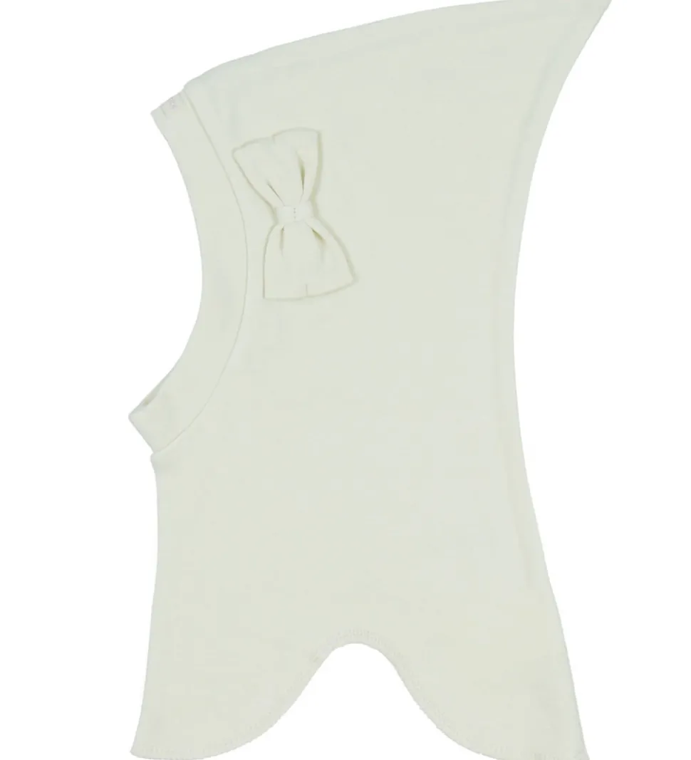 Sød Racing Kids elefanthue i cremehvid med en sløjfe på venstre side og en logoapplikation på toppen foran.