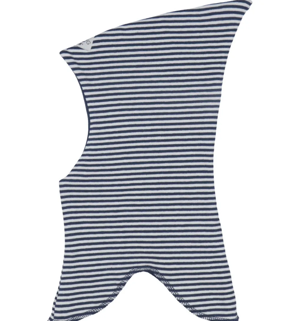 Sød Racing Kids elefanthue i et stribet design med navyblå og cremehvid samt en logoapplikation på toppen.