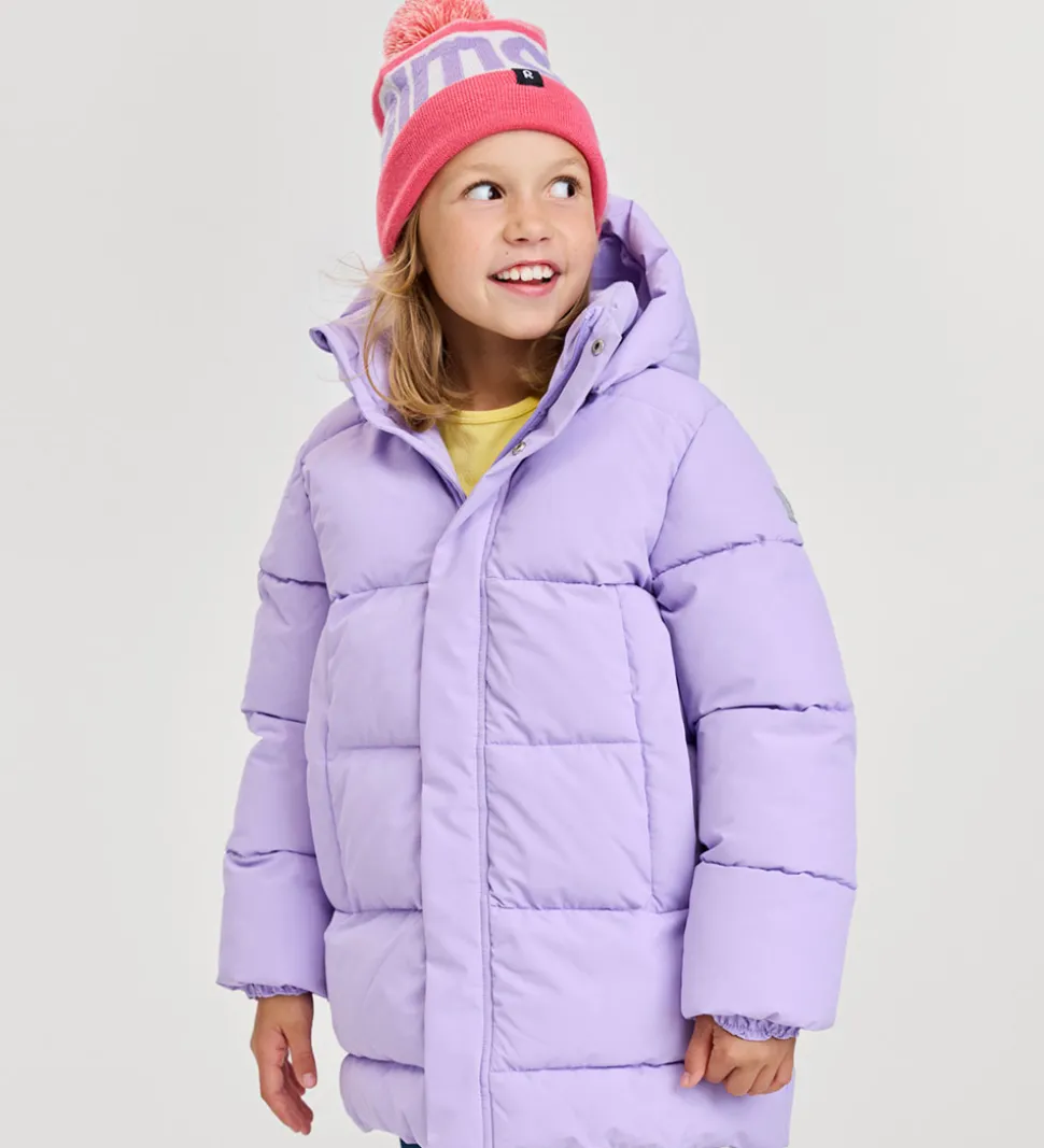 Reima dynejakken har en aftagelig hætte, som sidder fast med skjulte trykknapper omkring den høje halskrave, og ærmerne har praktiske elastikanter i åbningerne.