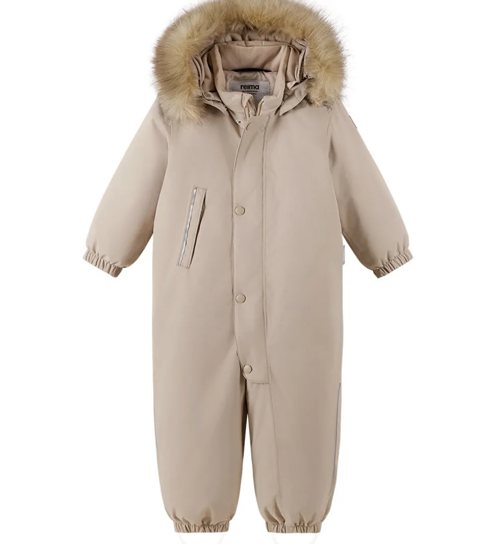Flot Reima flyverdragt i ensfarvet beige, og hætten har en flot kant af imiteret pels.