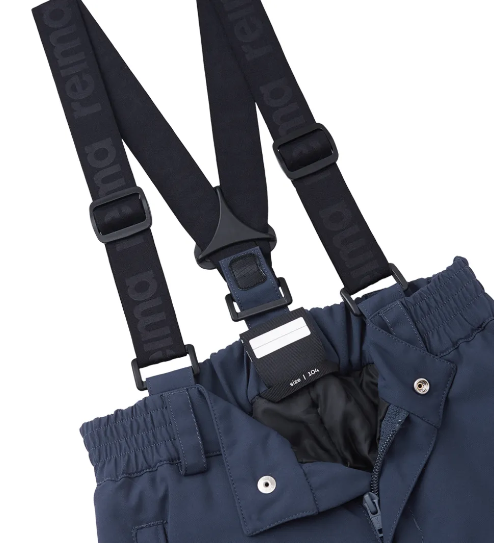 Reima skibukserne har en god elastik i livet, og de kan åbnes fortil med en trykknap og en lynlås. Der er aftagelige elastikseler, som kan justeres i længden.